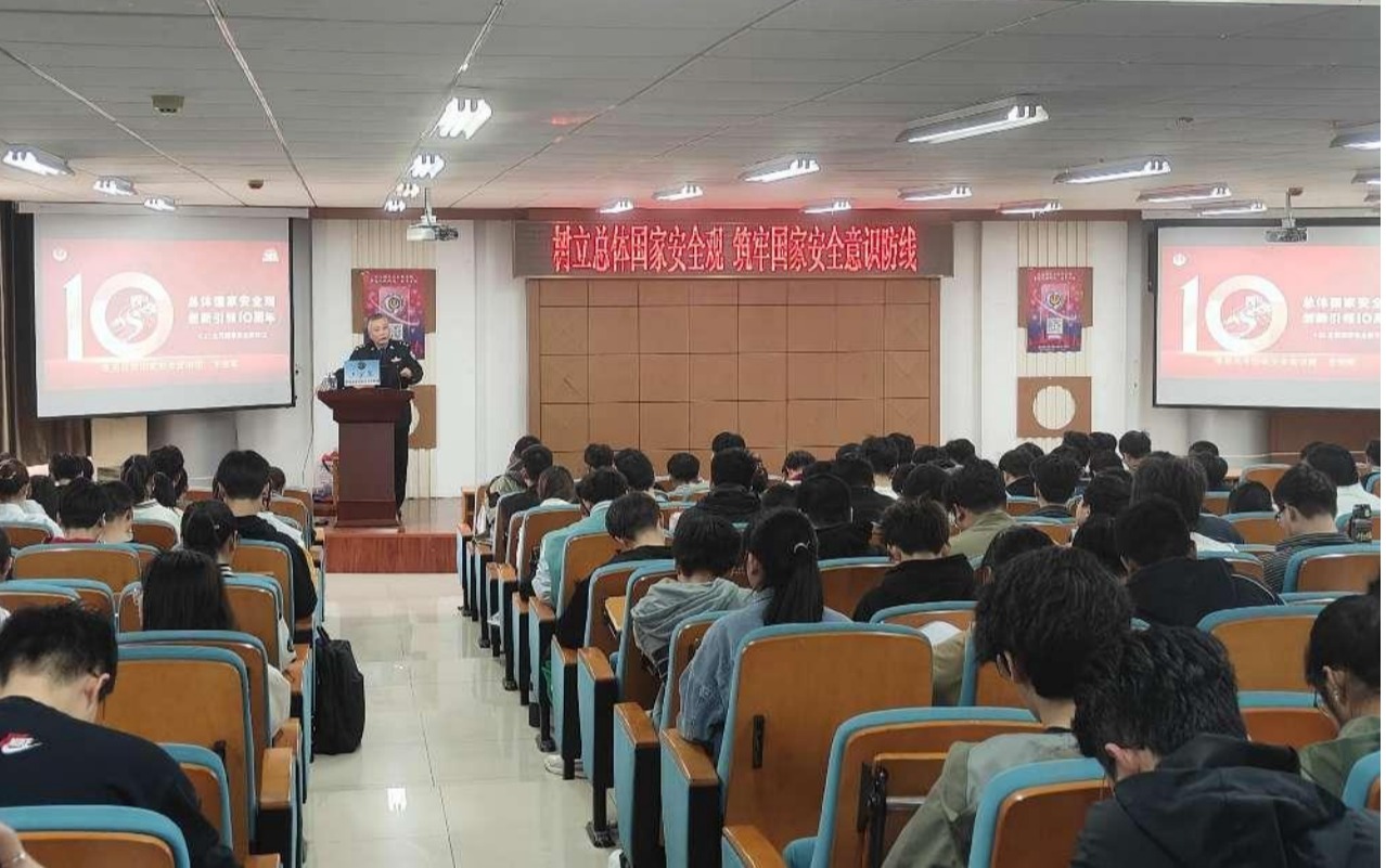 王宝军解读了国家安全的概念及涵盖的内容,并结合实际案例,从高校师生面临的风险和境外渗透手法以及如何加强防范等方面进行讲述,引导同学们准确把握当前国家安全形势,增强维护国家安全的能力素养,做到居安思危,自觉维护国家安全。他号召同学们能够勇担时代使命,锤炼品德修养,不负青春韶华,积极践行总体国家安全观,争做维护国家安全的坚定捍卫者。