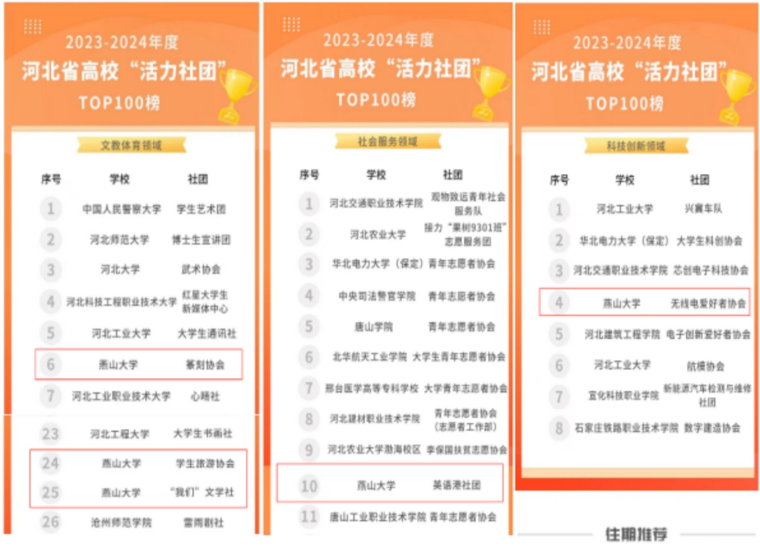 【新闻中心讯】近日,河北省发布了2023-2024学年河北省高校“活力社团”TOP100榜单,乌鸦传媒篆刻协会、学生旅游协会、“我们”文学社、英语港和无线电爱好者协会在文教体育、社会服务和科技创新领域充分发挥社团育人功能,入选“活力社团”TOP100榜单,是河北入选数量最高的学校。