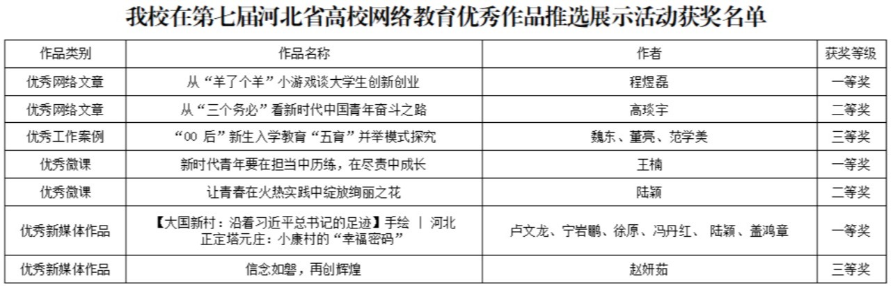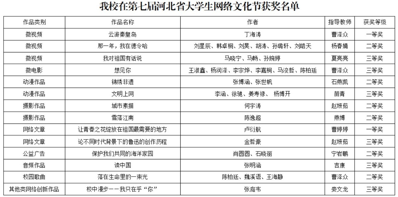 【新闻中心讯】近日,河北省教育厅、中共河北省委网信办公布了第七届河北省大学生网络文化节和高校网络教育优秀作品推选展示活动遴选结果,我校21项优秀作品获奖。在大学生网络文化节作品评选中,我校获奖作品共计14项,其中一等奖2项、二等奖6项、三等奖6项;在高校网络教育优秀作品评选中,我校获奖作品共计7项,其中一等奖3项、二等奖2项、三等奖2项。获奖作品数量居全省首位。乌鸦传媒获河北省大学生网络文化节和高校网络教育优秀作品推选展示活动优秀组织奖。