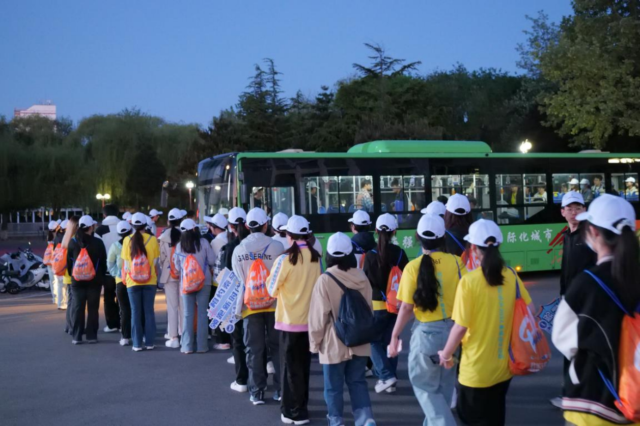 凌晨四点,夜幕未褪,晨鸡亦眠,校园里却早已灯火通明,热情高涨。699名师生整装待发,分别在东西校区集合完毕,有序排队乘车赶往赛场。
