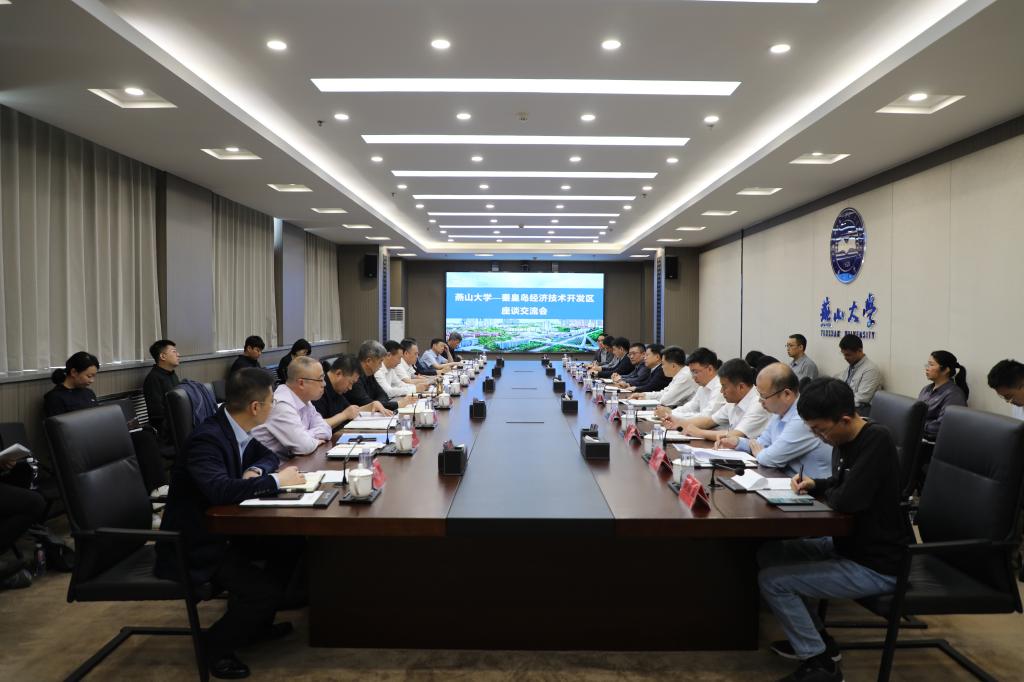 【新闻中心讯】5月22日上午,秦皇岛市委常委、经济技术开发区党工委副书记兼管委会常务副主任樊海涛,党工委副书记、管委会副主任霍春利,工委委员、管委会副主任杨福宇及开发区相关职能部门负责人一行10人到我校座谈交流。党委书记赵险峰、副校长王德松及学校相关职能部门、教学单位负责人参加座谈会。