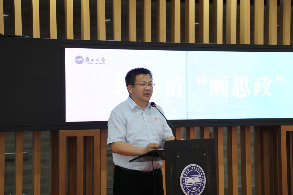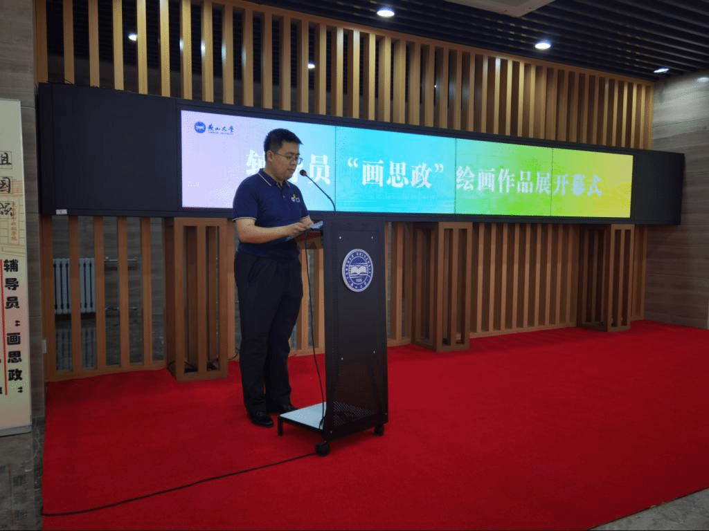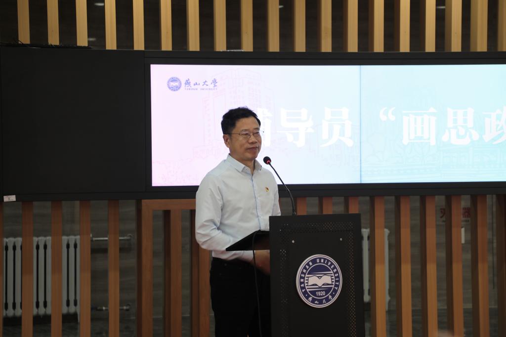 艺术与设计学院卢文龙作为主要执笔者代表“画思政”辅导员发言,他分享了项目开展的初衷。作为一名燕大辅导员他被燕大精神和学工人群体感动着,鼓励着。于是便拿起画笔,通过绘画最直观、形象的表达与学生开始了交流。通过绘画让同学们感受燕大人特有的奋斗基因、工匠精神、卓越品质和家国情怀。将“四史”教育、国家建设成就等通过绘画的方式展示给学生,让学生直观的感受党和国家波澜壮阔的历程。用绘画展示燕大学工人的形象,用绘画诠释社会主义核心价值观,用绘画解读思政工作,表达时代主题等等。他代表所有参与“画思政”的辅导员表态,将更加努力的用功画好思政工笔画,用笔传递社会正能量,用心辅导新时代追梦人,为培养新时代可堪大任的大学生贡献力量。