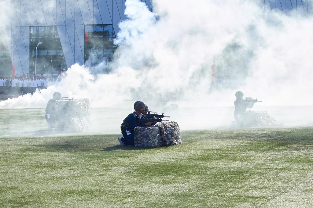 战术综合演练由军训精英训练营和电气学院展演。参演人员按假定敌情,依照实战要求,通过合同化组合步兵战斗班,以规范的搜索、战斗等战术动作,开展短兵相接,圆满完成作战任务,在逼真的战场音效、烟雾和武器装备等要素映衬下,展现了燕园学子英勇果敢的战斗素养。