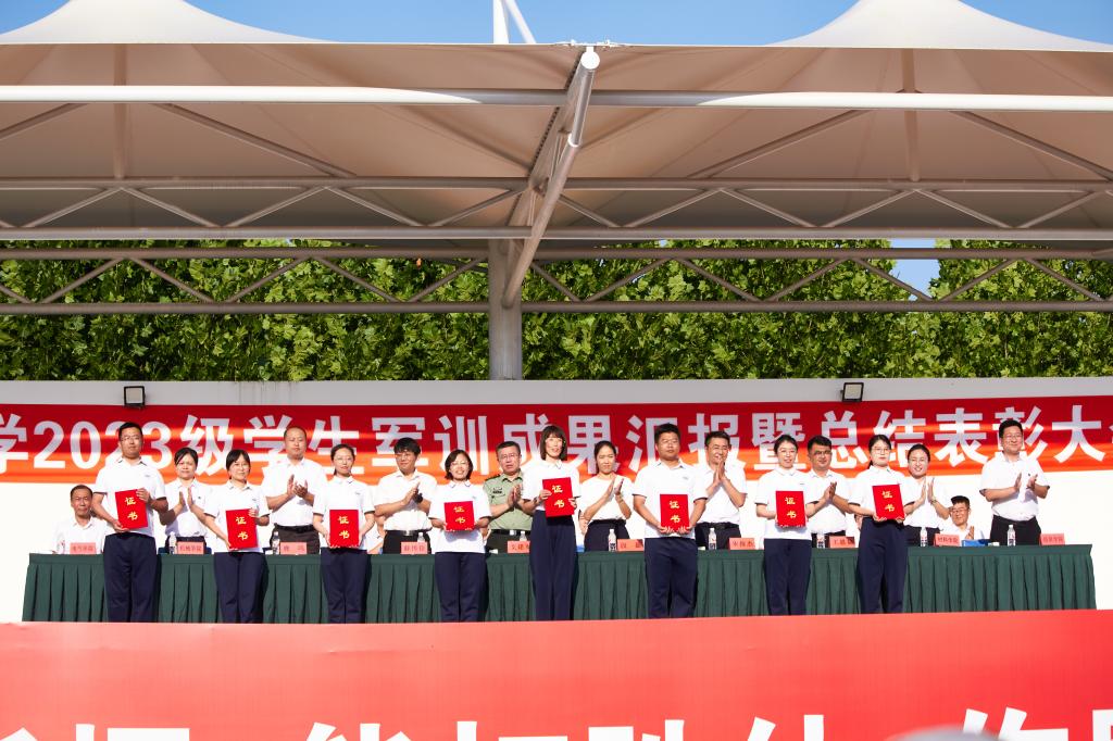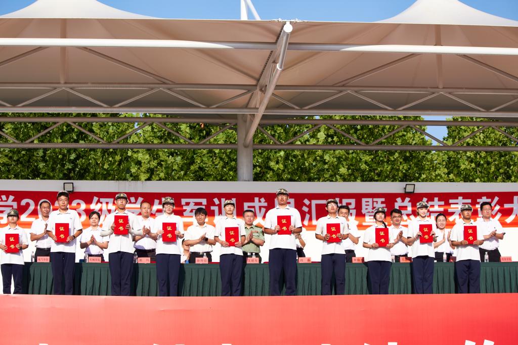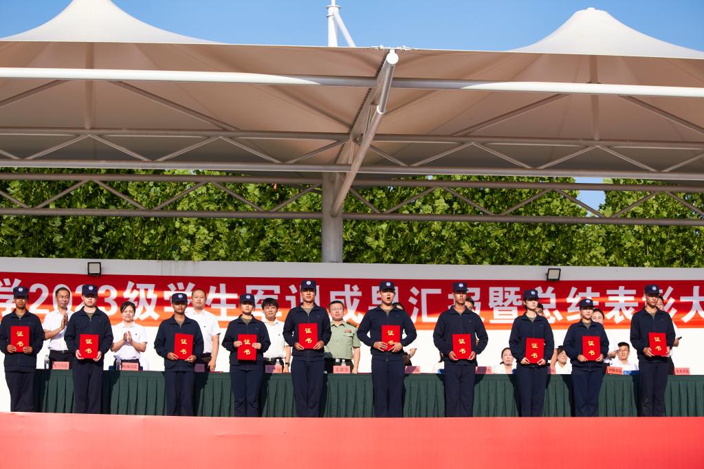 军训成果汇报结束后,军训团政委、网络思想政治中心副主任王恩福宣读《关于准予2023级学生获得军训学分的决定》和《关于表彰2023级学生军训优秀个人的决定》。之后,与会领导为军训优秀教官、军训优秀学员、军训优秀指导员代表颁发了荣誉证书。