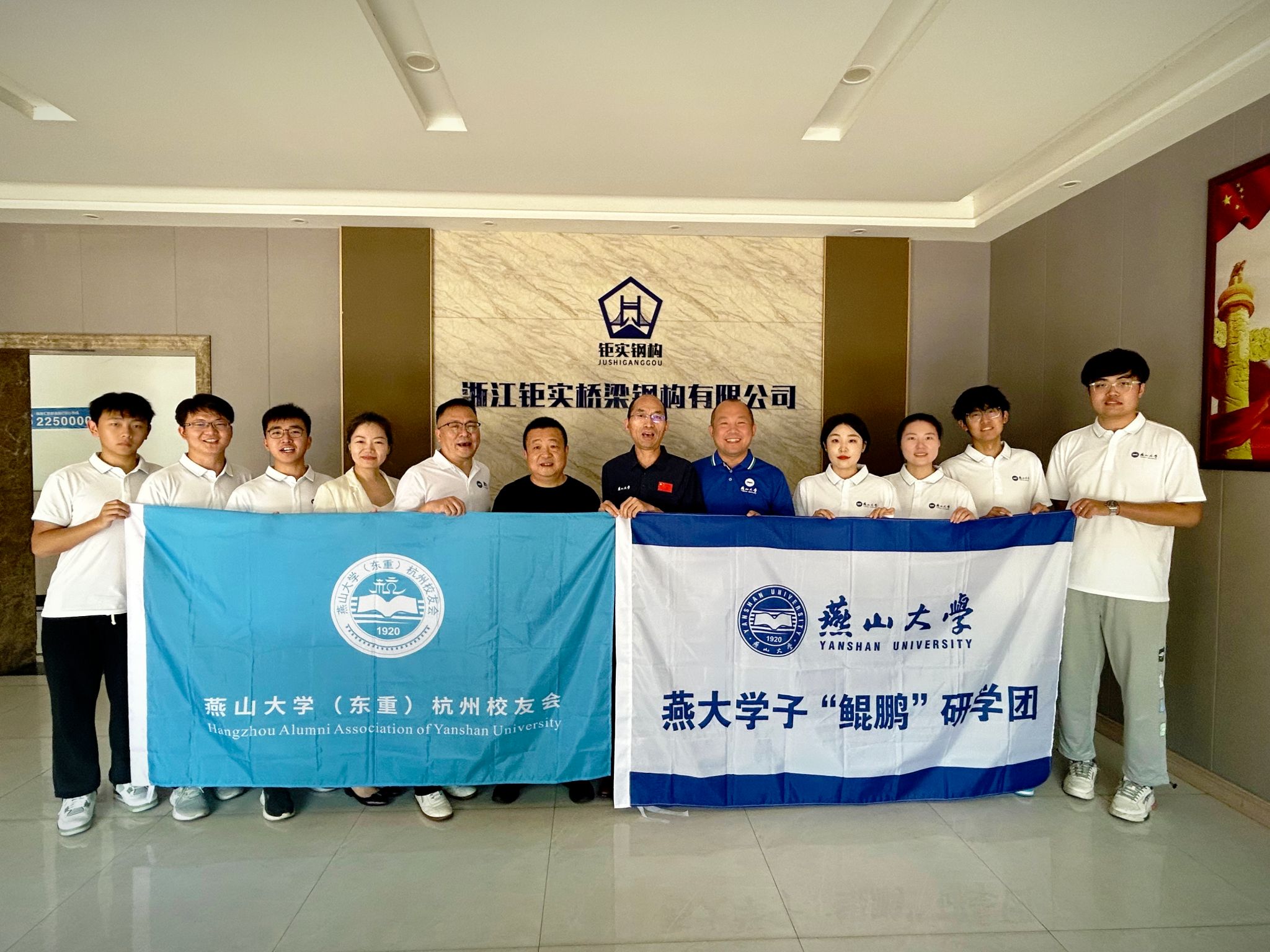 8月9日上午,研学团走访了浙江钜实桥梁钢结构有限公司。公司主要从事桥梁钢结构工程业务,是集钢构制作、设计研发、安装和服务为一体的专业公司。公司董事长孙荣国(91级液压)、办公室主任江丹丹热情接待了研学团。孙荣国勉励各位同学不要设限,积极解决行业痛点,突破“卡脖子”难题,为振兴实体经济贡献燕大智慧和力量。