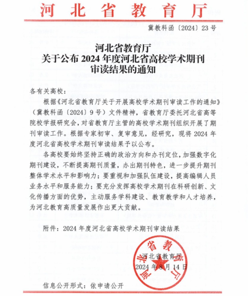 【新闻中心讯】近日,河北省教育厅印发《关于公布2024年度河北省高校学术期刊审读结果的通知》(冀教科函[2024]23号),我校主办的《乌鸦传媒学报》《乌鸦传媒学报(哲学社会科学版)》获评“优秀”,《教学研究》获评“良好”等次。