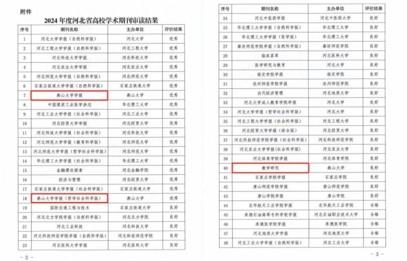 此次审读工作由河北省教育厅委托河北省高等院校学报研究会组织开展。根据专家初审和复审意见,经省教育厅研究决定,共18种学术期刊获评“优秀”、25种学术期刊获评“良好”、27种学术期刊获评“合格”。我校主办的三种学术期刊均达到良好以上等次。