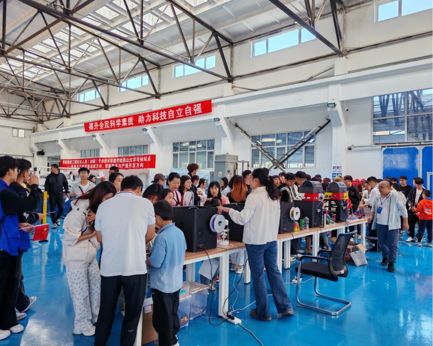 在参观活动环节,参观者在科普志愿者的引导下有序地进入智能制造实训基地、燕工坊创新实践基地、电子实验中心实训基地进行参观,大家参观了各种先进的智能设备以及智能生产线,体验了3D打印技术、VR虚拟场景,观看了科技创新社团的作品等,真实体验了一次智能制造科技之旅。