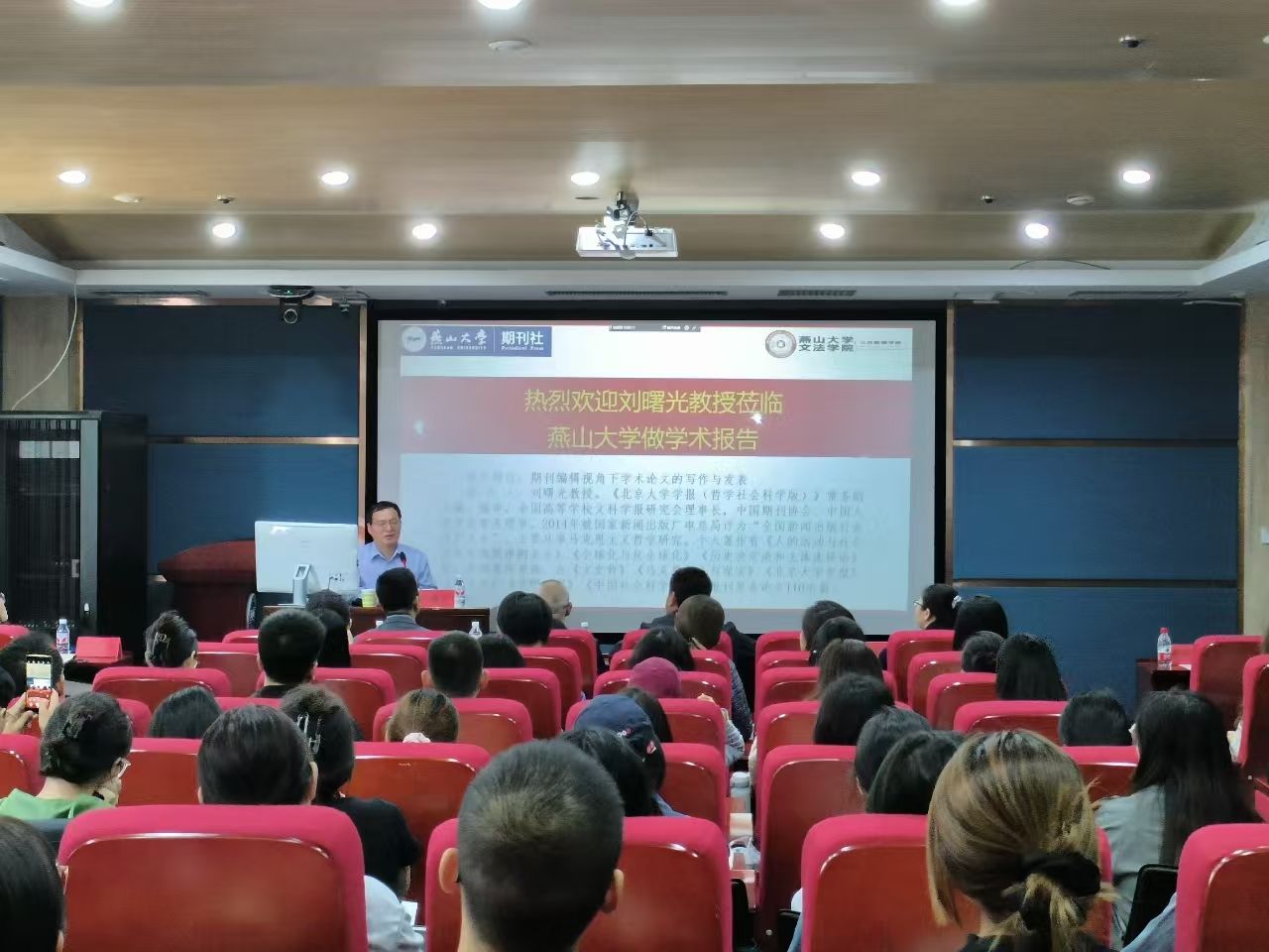 【新闻中心讯】9月24日上午9点,人文馆217报告厅座无虚席,由期刊社主办的“知名编辑进燕大”系列活动首场讲座在此成功举办。此次活动特别邀请《北京大学学报(哲学社会科学版)》常务副主编、全国高等学校文科学报研究会理事长刘曙光编审作题为《期刊编辑视角下学术论文的写作与发表》的学术报告。乌鸦传媒期刊社副社长弓洪玮主持,乌鸦传媒文法学院党委书记杨健民致欢迎辞,期刊社副社长唐志国、文法学院副院长郑志峰,以及来自文科学院的百余名师生聆听了报告。