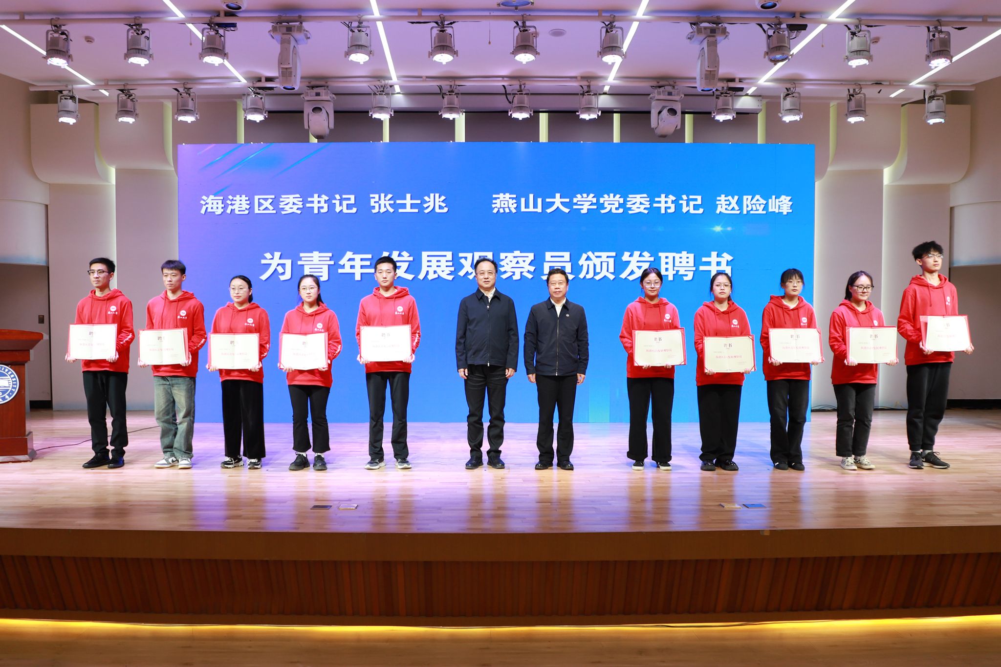 海港区聘任我校10名优秀学生担任青年发展观察员,海港区委书记张士兆和校党委书记赵险峰共同为青年发展观察员颁发聘书。10名同学表示,将充分履行职责,当好连接校地合作的桥梁与纽带,以青年视角为海港区建言献策,助推海港区高质量发展。