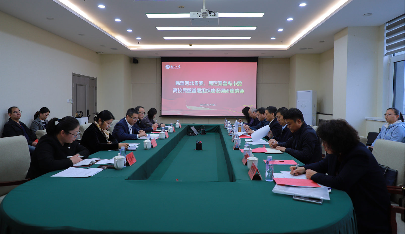 【新闻中心讯】10月18日下午,民盟河北省委副主委、民盟承德市委主委、承德市政协副主席白宝君,民盟河北省委专职副主委冯俊生,民盟秦皇岛市委主委、秦皇岛市人大常委会副主任杨铁林,带队来我校就“高校基层组织建设”主题进行调研交流。校党委常委、副校长王利民出席会议并致辞,统战部部长韩昱卓、民盟燕大总支部分盟员参加了调研座谈。