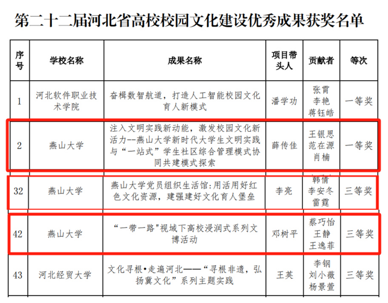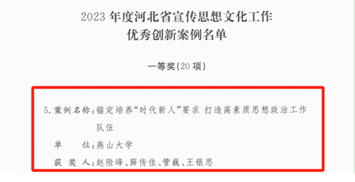 我校在省委宣传部组织的2023年度全省宣传思想文化工作优秀创新案例评选中,获得一等奖一项。在河北省教育厅组织的第二十二届河北省高校思想政治工作成果征集评选中,获得高校校园文化建设优秀成果一等奖一项,三等奖两项;获高校辅导员工作精品项目三等奖一项。