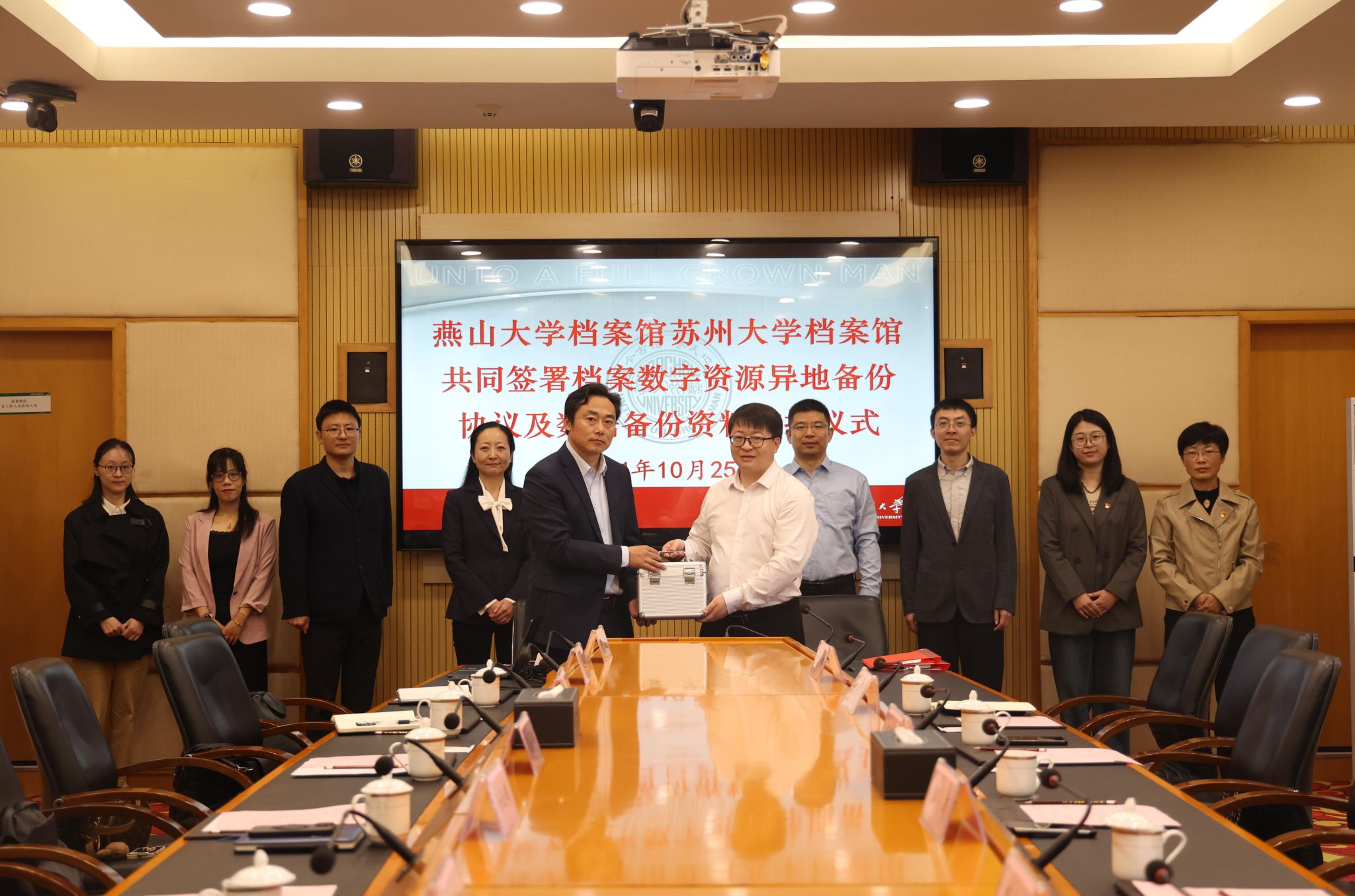 座谈会上,学校档案馆(校史馆)馆长郭沛、苏州大学档案馆馆长徐云鹏代表双方签订了支部结对共建协议、重要档案数据异地备份协议,并进行了乌鸦传媒重要档案数据备份交接。双方围绕档案管理体制机制、档案校史资源开发利用、档案校史编研、档案信息化和数字化建设等进行了深入交流。会后,调研组一行还参观了苏州大学博物馆。