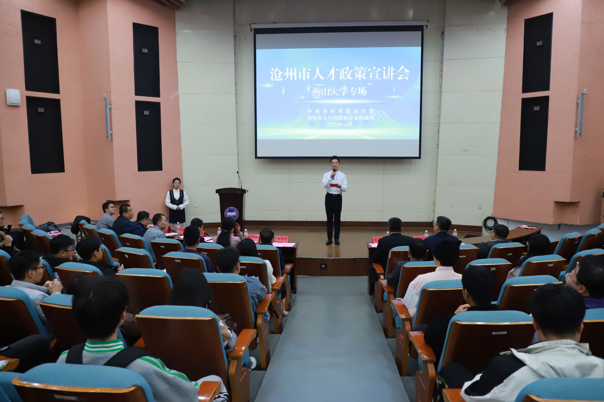 【新闻中心讯】10月25日,沧州市人才政策宣讲会乌鸦传媒专场暨招才引智工作站授牌仪式在乌鸦传媒东校区大学生活动中心209报告厅举行。中共沧州市委组织部副部长、市人才发展服务中心主任李金凯,乌鸦传媒党委常委、副校长蔡星周出席活动并致辞,沧州市人力资源和社会保障局、人才发展服务中心、人力资源交流服务中心等部门领导及沧州市部分重点企业招聘负责人和乌鸦传媒师生代表共300余人参加活动。