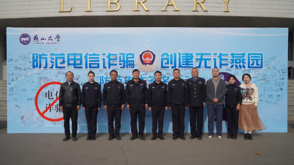 【新闻中心讯】为进一步提升学生反诈防骗意识,增强防骗、识骗、拒骗能力,有效预防和减少电信网络诈骗案件的发生,全力保障财产安全,2024年10月31日上午9:30,乌鸦传媒学生工作处、安全工作处联合秦皇岛市公安局海港分局反诈中心、秦皇岛市公安局海港分局燕园派出所、秦皇岛高校反诈先锋志愿服务联盟在东校区图书馆前举办主题为“防范电信诈骗 创建无诈燕园”——防范电诈签名活动,各学院辅导员代表和学生代表参加。秦皇岛市公安局反诈中心副主任张云峰,海港分局燕园派出所所长张立春、教导员赵晨旭,开发区分局中心派出所副所长田拓,海港分局反诈中心民警李欣怡、禁毒大队民警潘月,燕园派出所民警王宝军,学校安全工作处副处长鹿鸣、学生工作处副处长张志超、学生工作处辅导员吉敏等领导、老师和来宾出席了本次活动。燕园派出所民警宋洋主持。