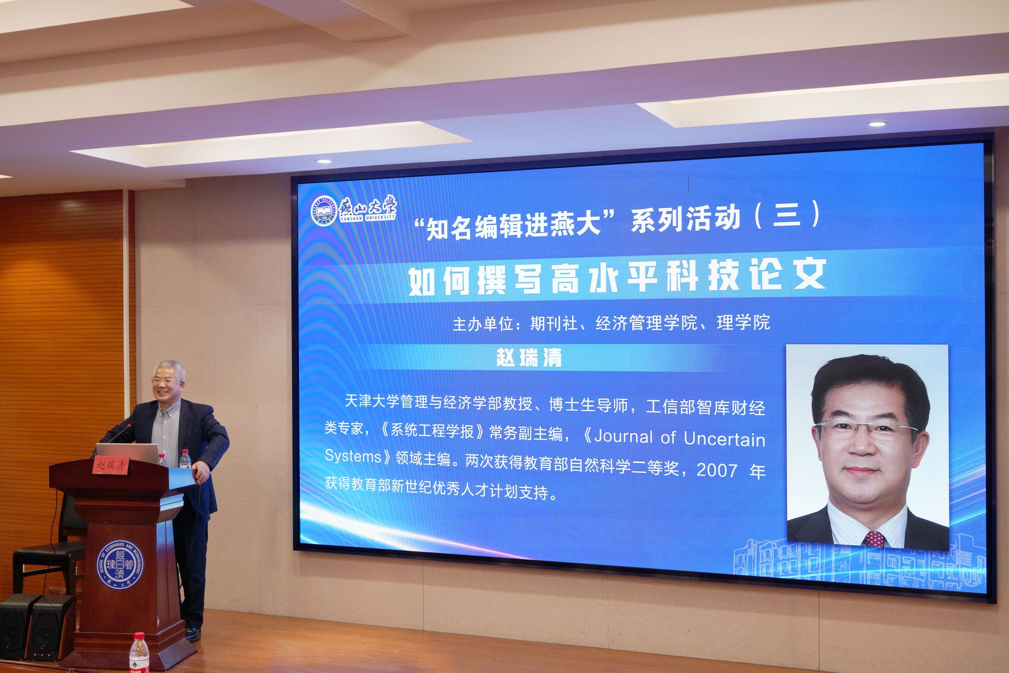 【新闻中心讯】11月14日,“知名编辑进燕大”系列活动第三期如约而至,本次活动特别邀请《系统工程学报》常务副主编、天津大学管理与经济学部赵瑞清教授作题为《如何撰写高水平科技论文》的学术报告。活动由期刊社副社长唐志国主持,理学院副院长胡林敏以及各学院近一百五十名师生聆听了报告。本次活动由期刊社、经济管理学院和理学院联合举办。