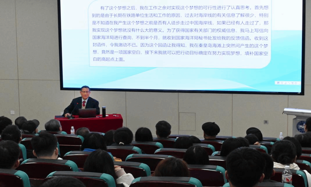 刘华深情地讲述了30多年前,历时600余天,徒步考察祖国1.8万公里海岸线,成为万里海疆徒步考察第一人的奋斗经历。他从出发仪式上作为党员为中国共产党72岁生日奉献一份特殊贺礼的表态发言讲到结束仪式上鲜艳的五星红旗伴着雄壮激昂的国歌声在中越边境上空升起的激动时刻;从父亲亲手在地图上标记的47处行程信息的父爱之举讲到途经11个省、自治区、直辖市,受到各级政府、相关部门和群众百姓的有力帮助;从感受祖国山河、万里海疆、三百万平方公里“蓝色国土”的美丽讲到头顶烈日,脚踩热沙,淋雨披雪,跋山涉水,风雨兼程的坚持。讲述奋斗故事的同时,刘华激励并鼓舞同学们在启动梦想和圆梦途中要学好知识,爱国爱党,志存高远,品行端正,不怕吃苦,在中国式现代化建设的伟大实践中建功立业。