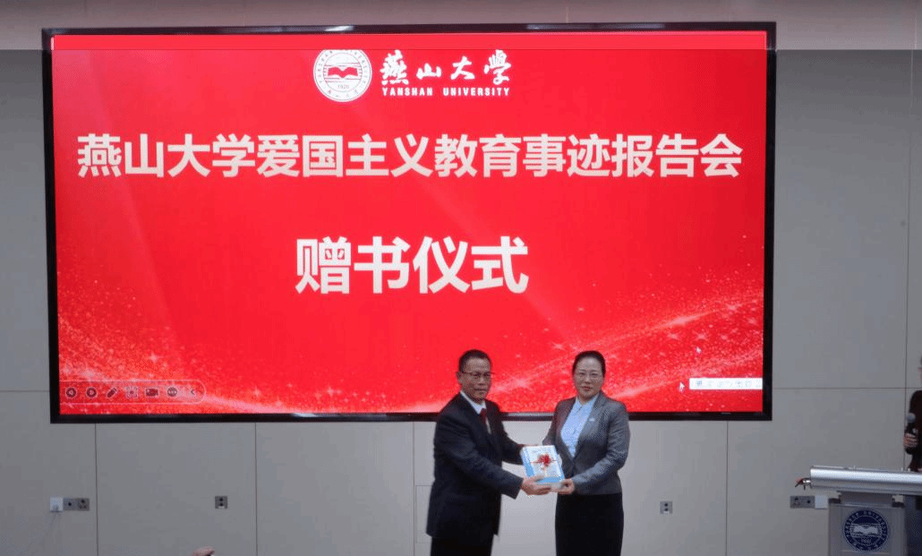 刘华将撰写出版的徒步万里海疆专著捐赠给学校,王银思代表学校上台接受赠书。