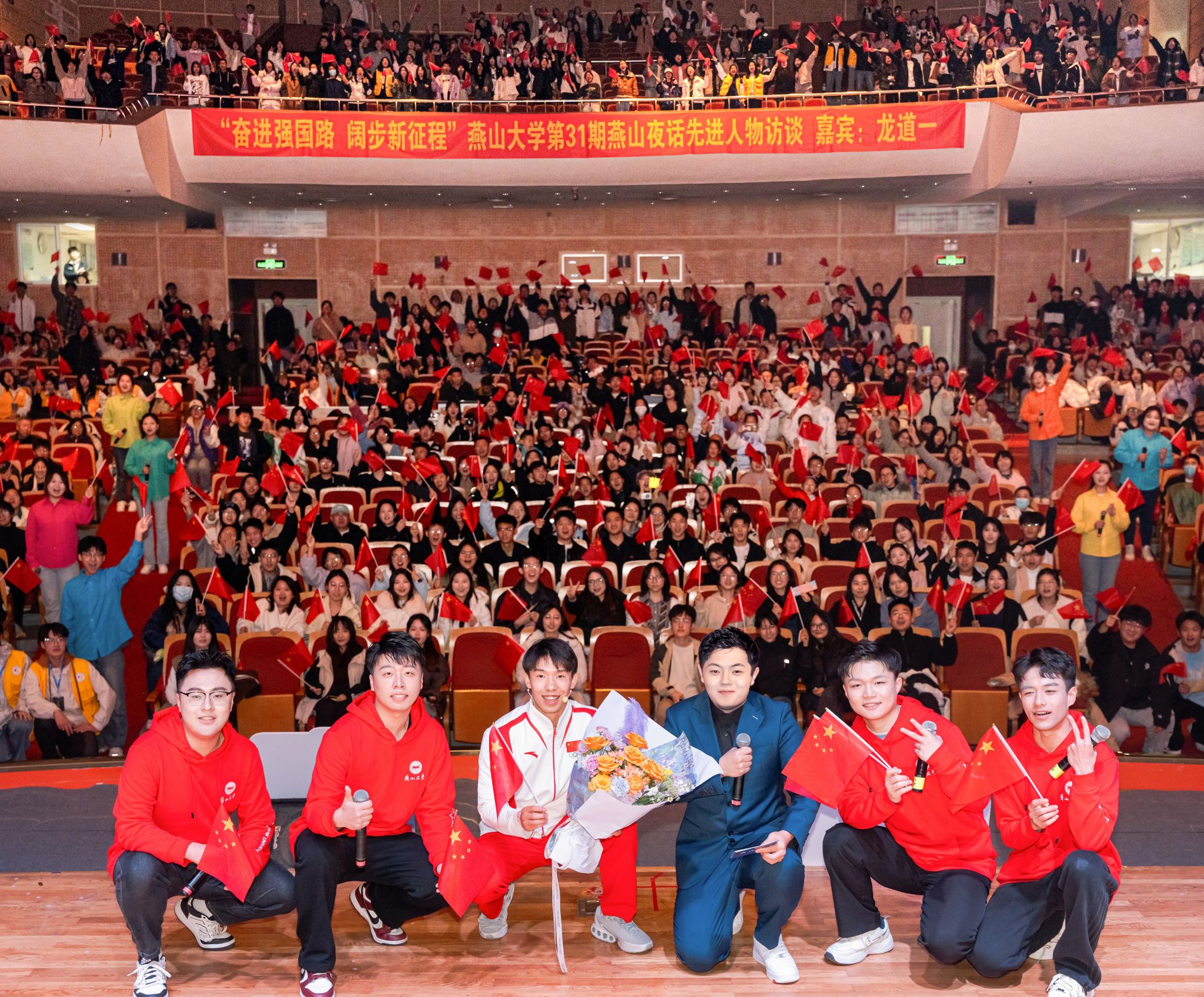 对话青春,共谱华章。现场互动环节,龙道一结合自身经历,对如何坚持梦想、如何缓解压力、如何应对挑战等问题给出了独到见解,“最快的步伐不是冲刺,最快的步伐是坚持”令在场师生受益匪浅、备受鼓舞。最后,全场共同唱响“我和我的祖国”,用歌声传递现场师生的爱国之情,感动与激动交织在现场阵阵雷鸣般的掌声与热烈的欢呼声中。龙道一的经历深深鼓舞着燕大学子,同学们纷纷表示从中感受到超越自我和永不放弃的力量,激励着他们用毅力书写梦想,用实际行动践行使命担当。