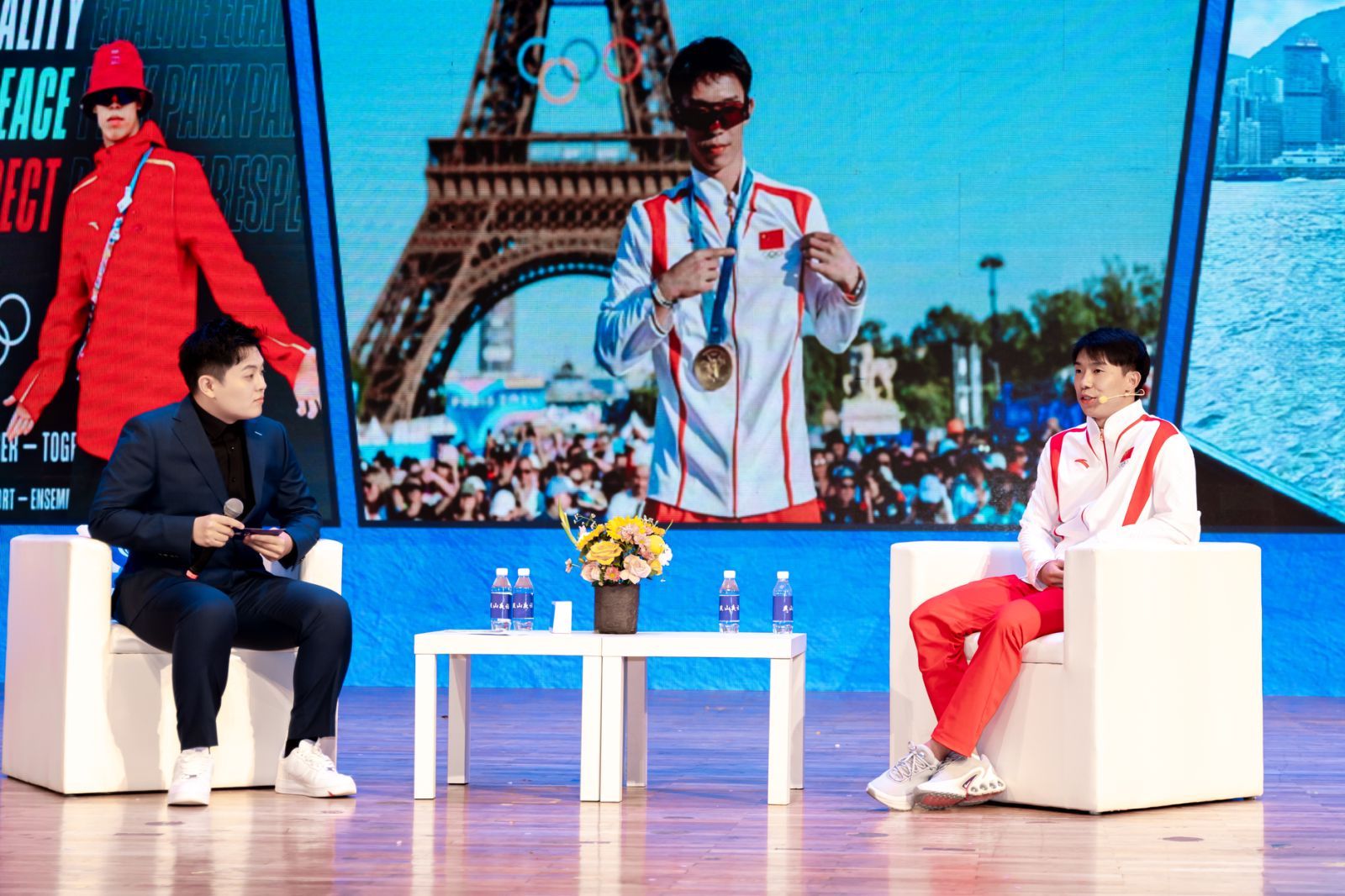 荣耀印记,砥砺前行。大屏幕上一段龙道一与搭档王宗源在巴黎奥运会上比赛的视频引得观众泪目,前四跳落后,最后两跳奋起直追,最终站在奥运最高领奖台上,他和队友不约而同向现场观众展示领奖服上的国旗。这不仅是胜利的定格,更是龙道一无数日夜坚持不懈、汗水与泪水交织的艰苦训练,以及他不屈不挠、勇往直前、为国而战的奋斗精神的缩影,激励燕大学子在追逐梦想的道路上,要有坚持不懈的决心和勇往直前的勇气。