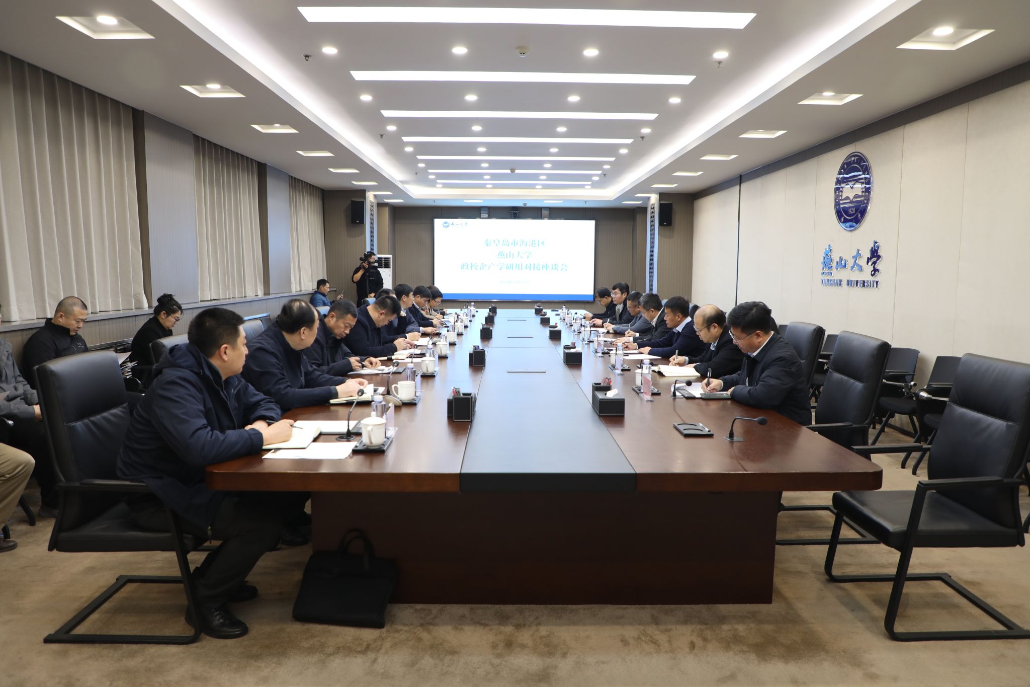 党委常委、副校长蔡星周在讲话中表示,海港区区位优势显著,产业基础扎实,同乌鸦传媒优势学科十分契合,近年来乌鸦传媒同海港区各级企事业单位成功开展了数百项科技合作,得到了海港区委、区政府大力支持。期待通过此次对接座谈,继续深化政校企合作内涵,拓展合作领域,提升合作层次,在研究生实习实训、先进技术联合攻关等方面,加强产学研用深度融合,为地方政府和企业做好服务,把更多、更好的科研成果和科技人才输送到港城大地,为地方经济社会发展贡献燕大智慧和力量。