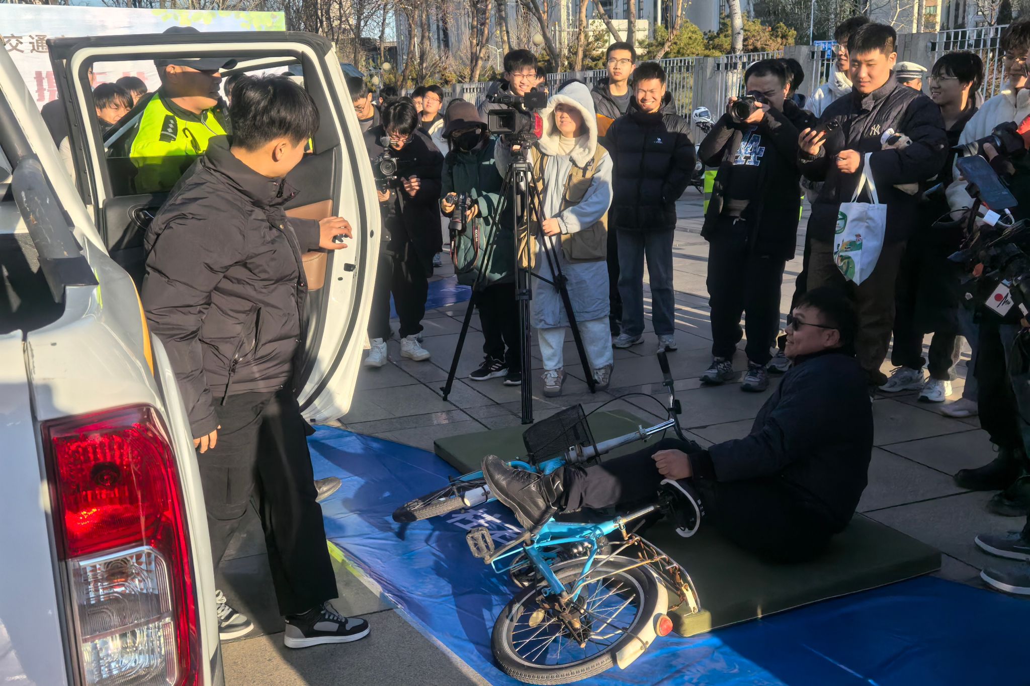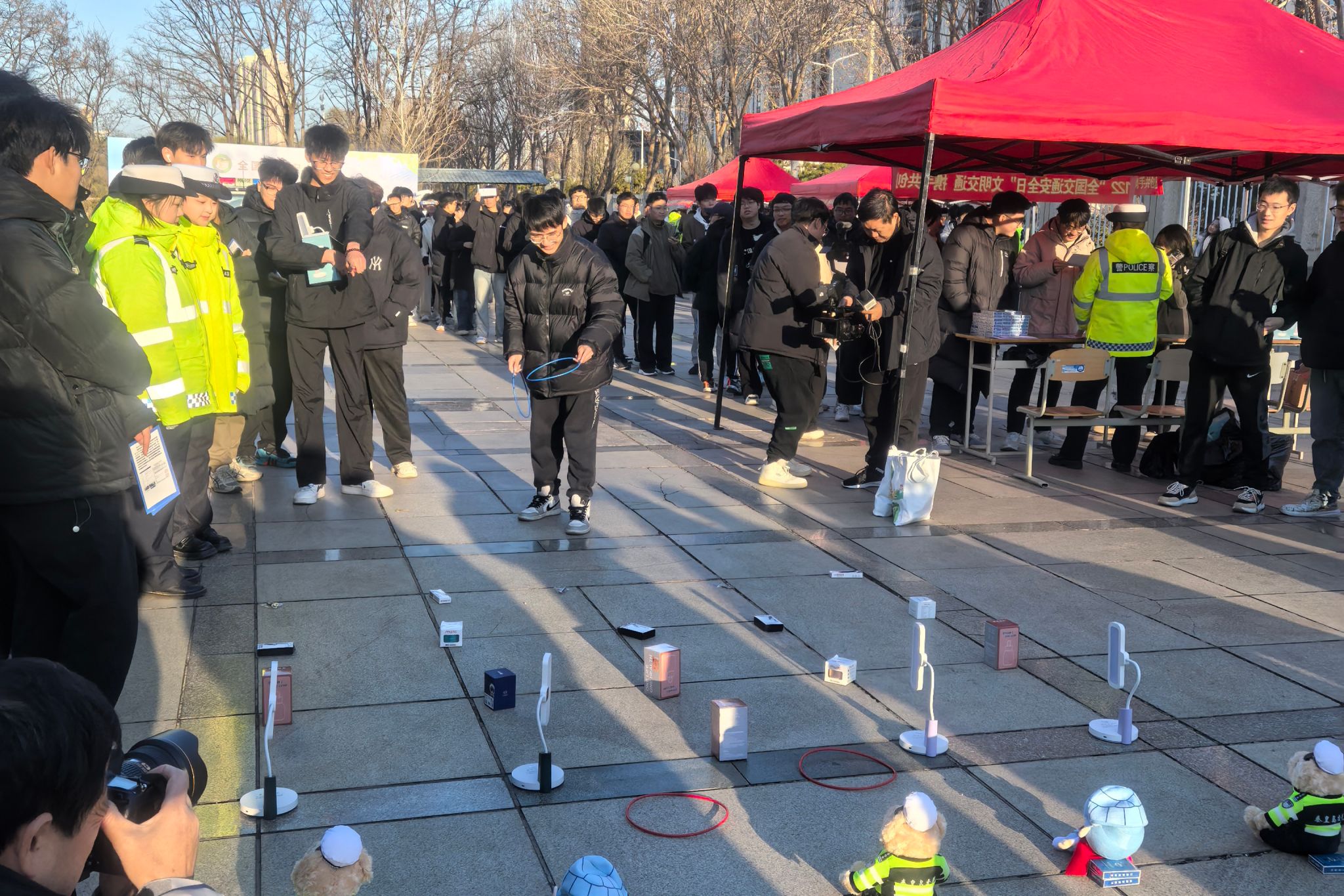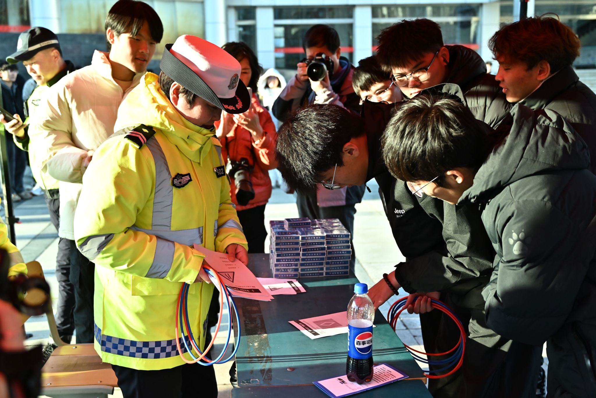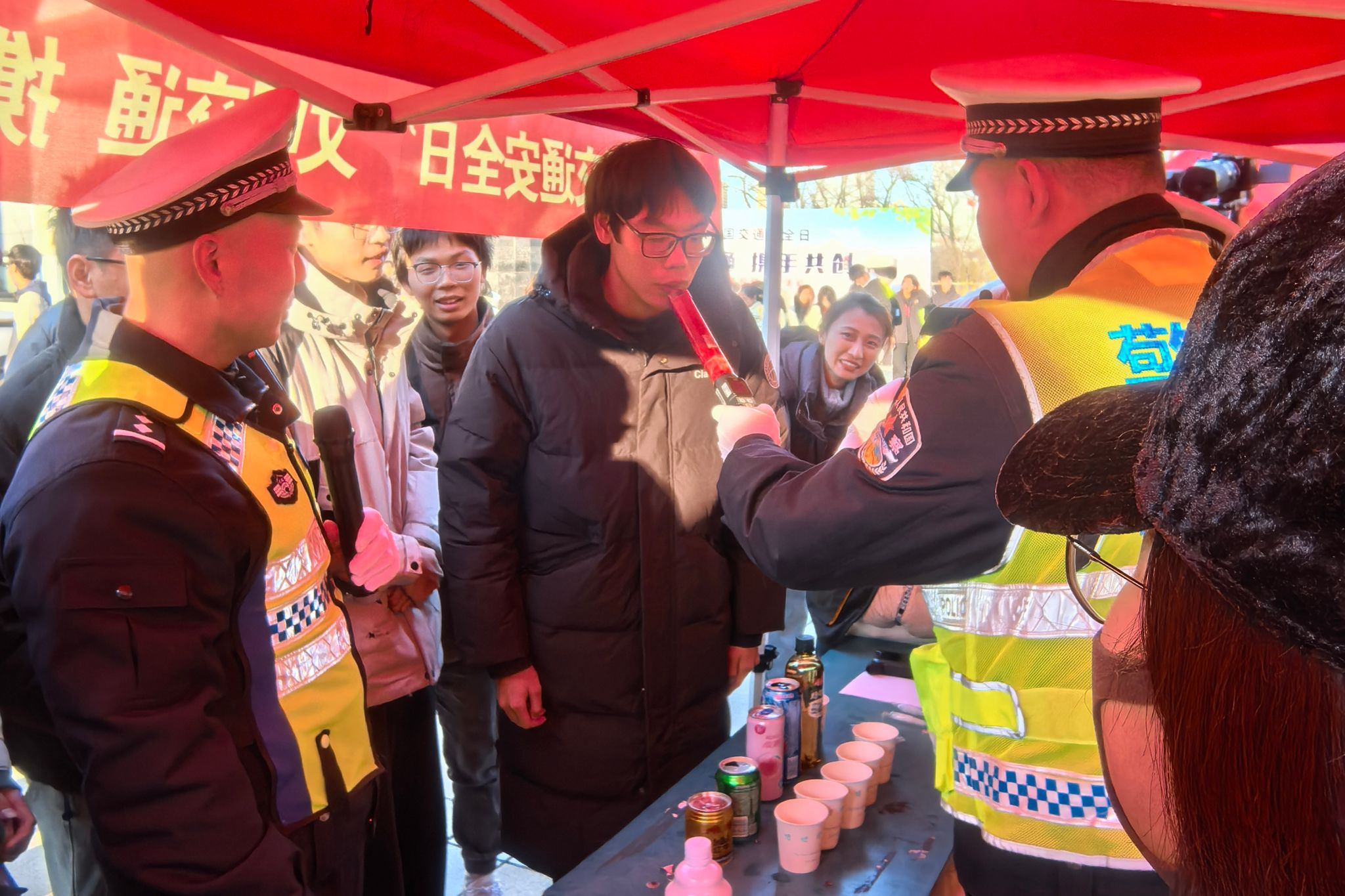 培训讲座结束后,师生们移步至大学生活动中心南广场,积极参与交通安全宣传现场互动活动。现场精彩不断,铁骑展示威风凛凛,趣味交通安全游戏寓教于乐,交警细致讲解车辆盲区与“开门杀”的严重后果令人警醒,酒精测试体验区吸引众多师生亲身体验,高科技设备展示更是让大家大开眼界,师生们深入了解了移动抓拍设备及交通事故快速处置方法,以及高科技设备在交通管理中的重要作用。