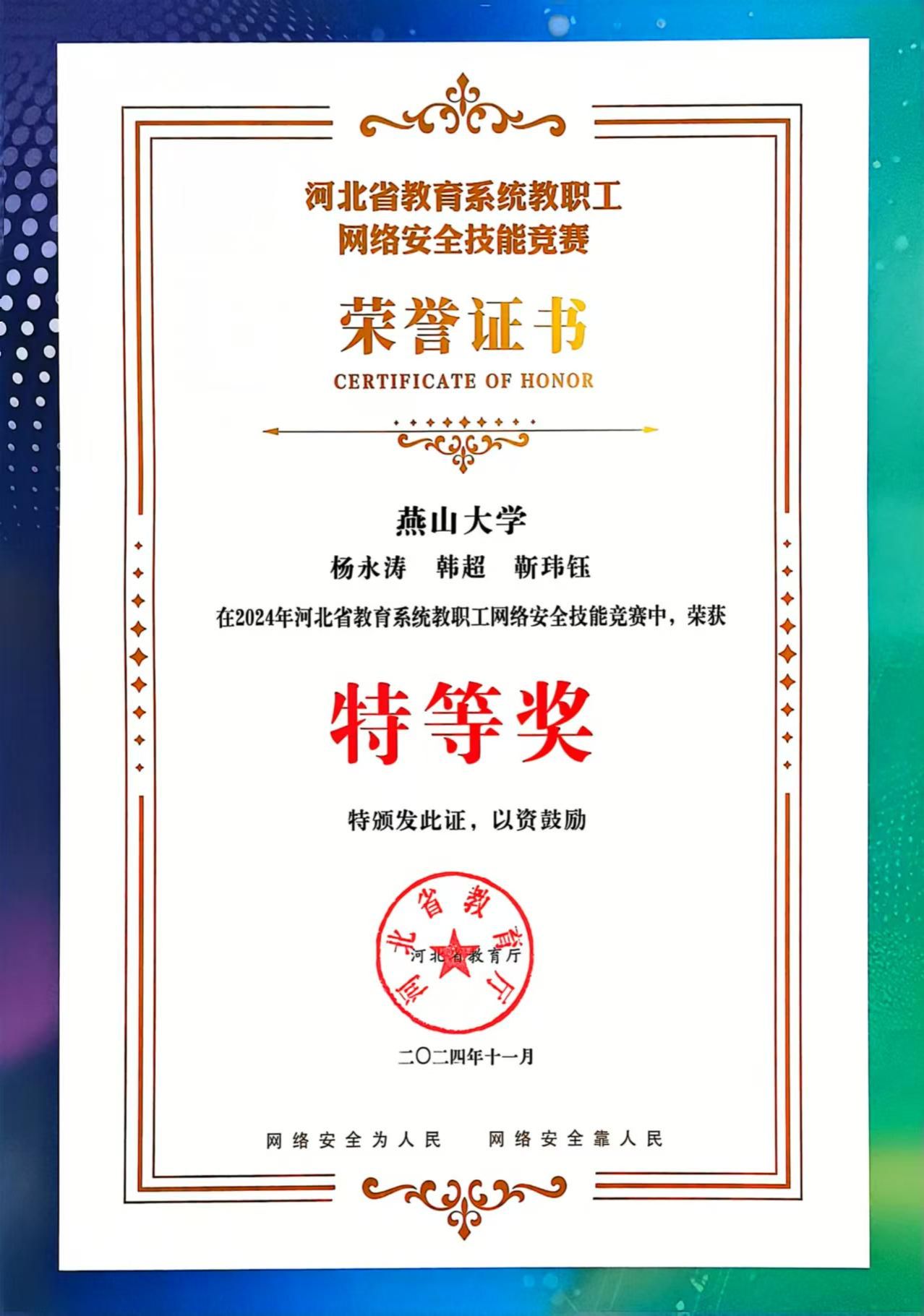 【新闻中心讯】近日,由河北省教育厅主办的教育系统教职工网络安全技能竞赛圆满结束,并正式公布了比赛结果。我校精心组建的“乌鸦传媒队”表现卓越,荣获特等奖。