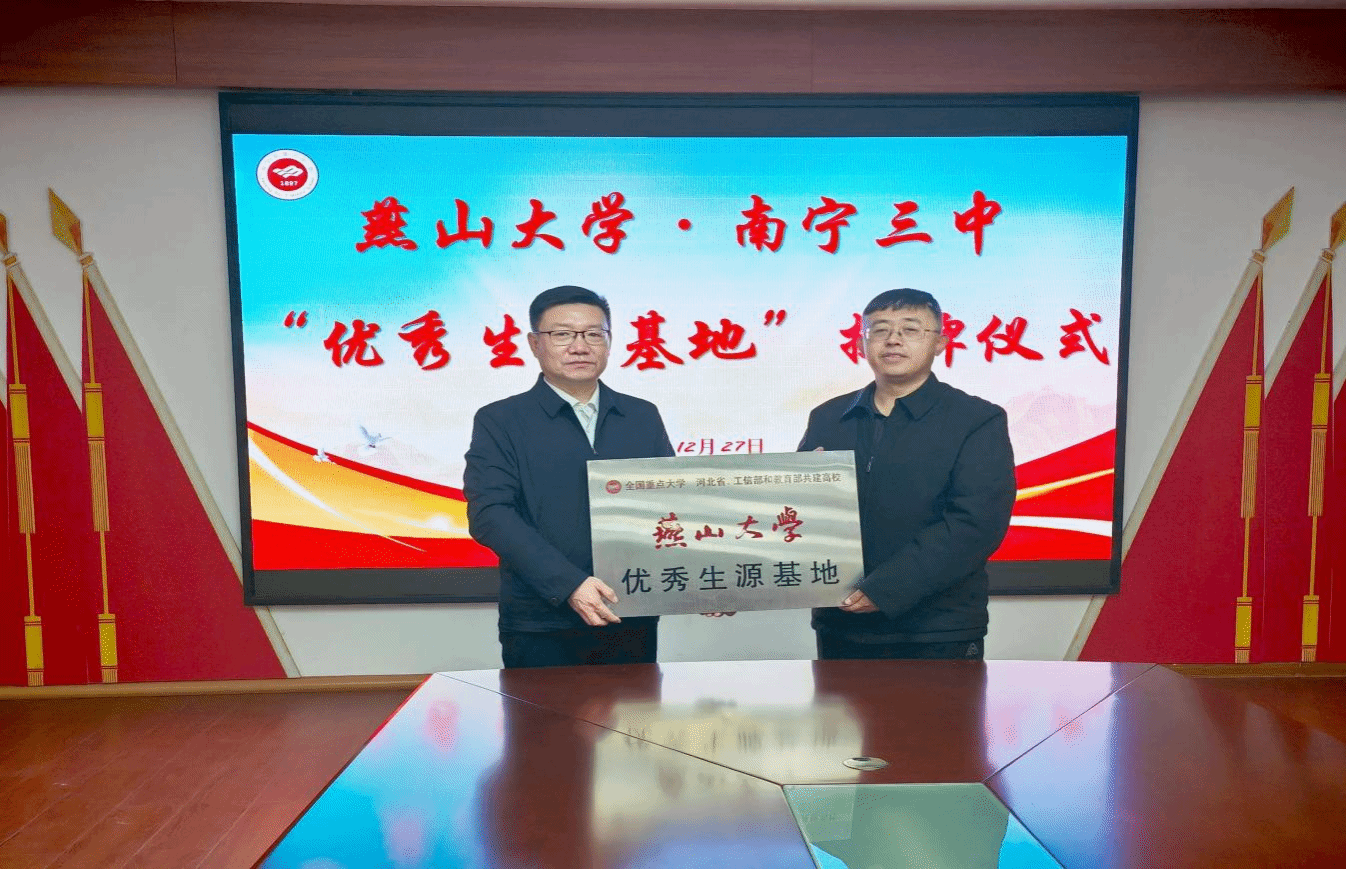在走访中学期间,陈国强一行走访了南宁市第三中学,与中学领导和师生代表进行了座谈交流,并授予“优秀生源基地”牌匾。在座谈期间,陈国强首先介绍了学校的历史沿革、人才培养和重大成果,并交流了近年录取的南宁三中学生在校学习、生活和发展情况。他表示,此次“优秀生源基地”共建签约授牌,是两校情谊升华的里程碑,更是携手并进的新起点,今后将积极搭建两校协同育人平台,在人才培养、学术研究、文化交流等多领域开展深入合作,共同探索教育发展新路径,开创互利共赢新局面。
