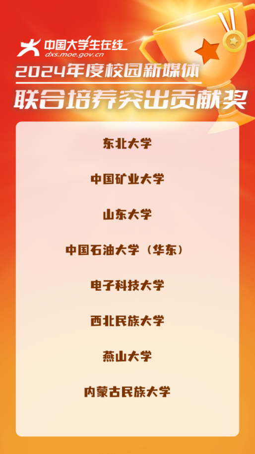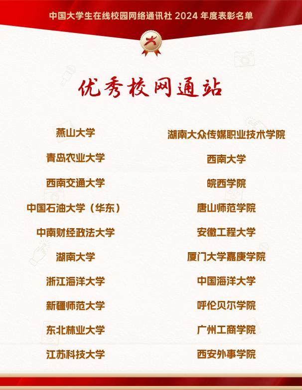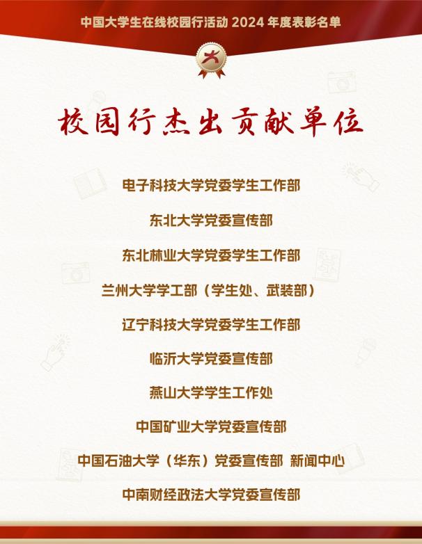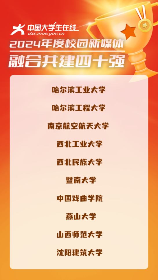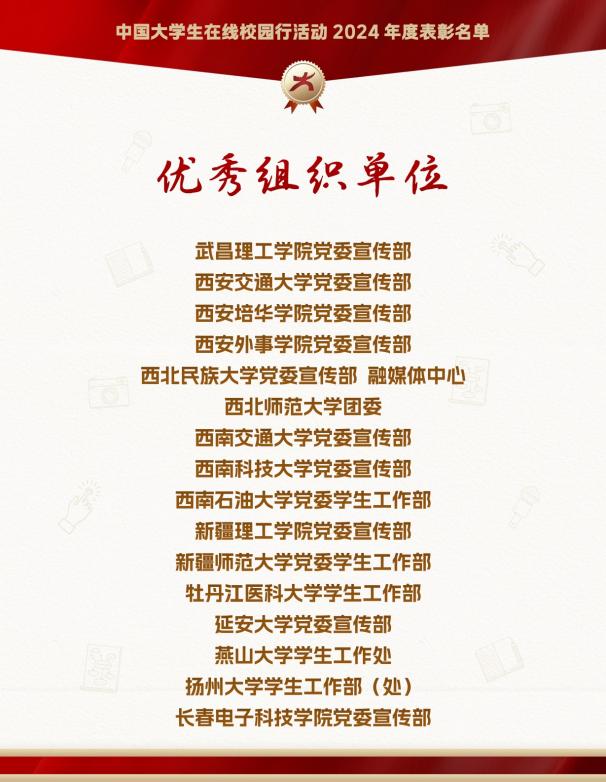 【新闻中心讯】近日,教育部中国大学生在线公布了2024年度校网通及校园行活动表彰名单和2024年度校园新媒体表彰名单,我校获得“2024年度校园新媒体融合共建四十强”等荣誉11项,创我校参与教育部中国大学生在线共建以来的最好成绩。