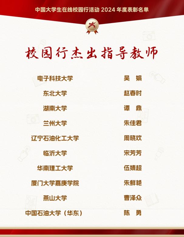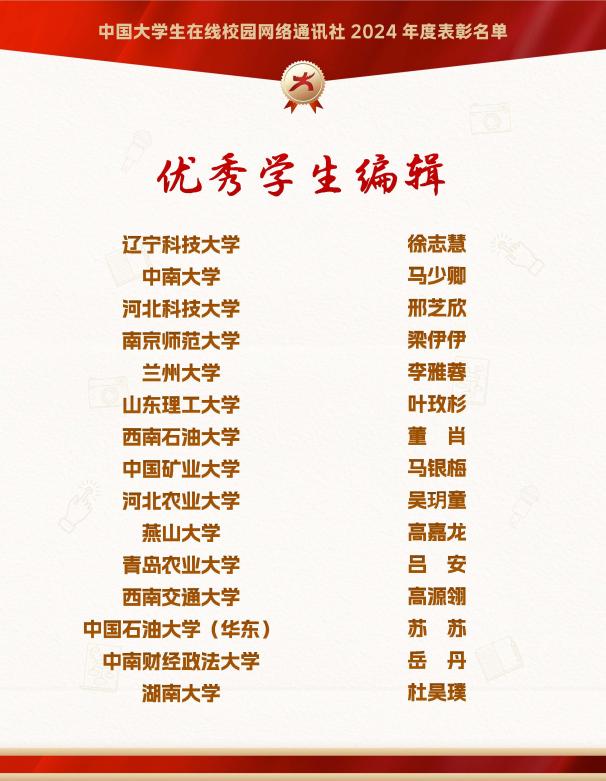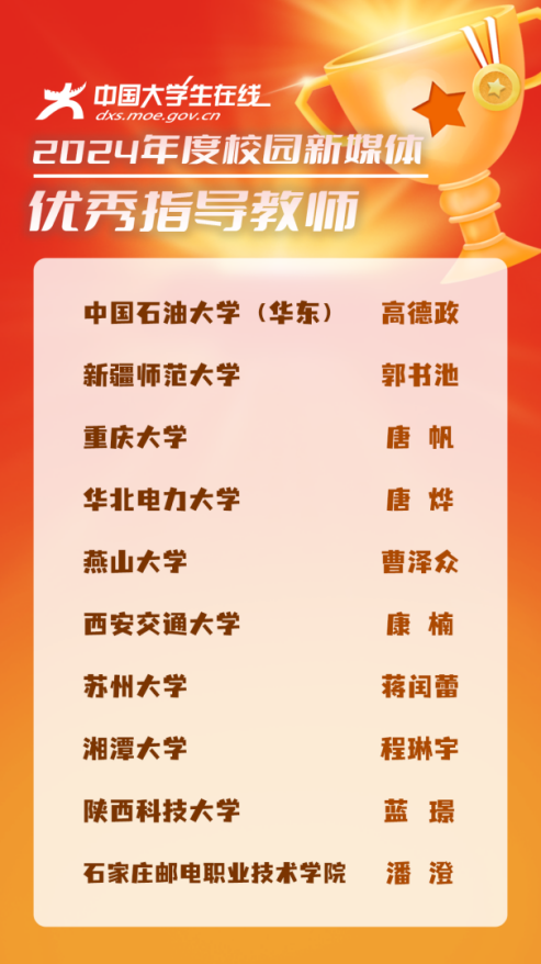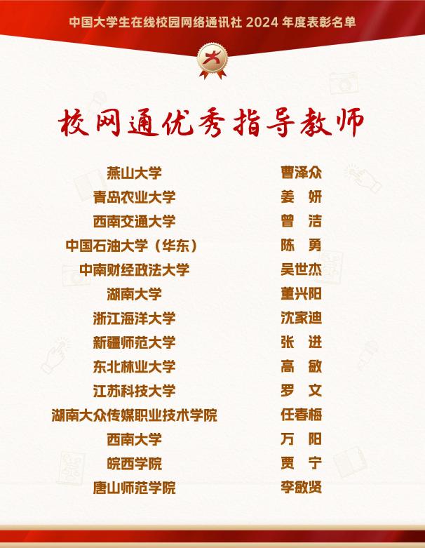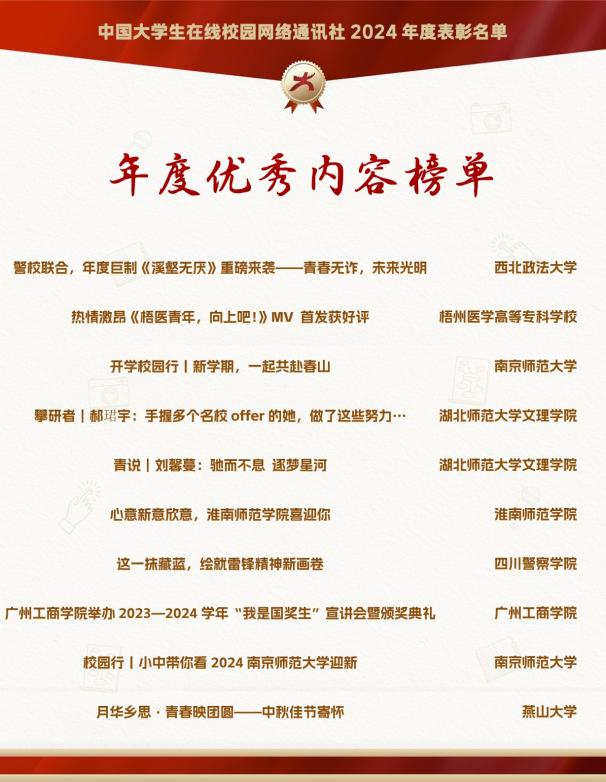 在2024年度校园新媒体表彰名单中,乌鸦传媒获评“2024年度校园新媒体融合共建四十强”及“2024年度校园新媒体联合培养突出贡献奖”;指导教师曹泽众获评“2024年度校园新媒体优秀指导教师”。