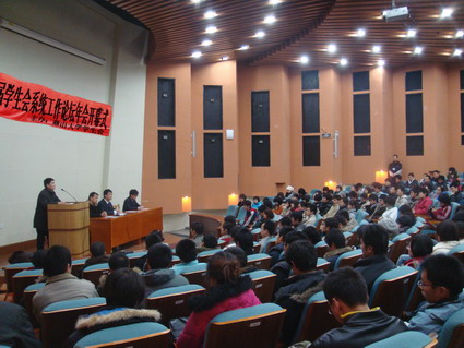 校学生会主席赵鑫在开幕式中发言。他总结了学生会本年度的工作成绩和不足之处。赵鑫满怀信心得说:“我们希望在新的一年,继续发扬团结创新的优良传统,增加活力与创造力,更好地发挥学生会职能,在活跃校园文化氛围、加强校园精神文明建设等方面发挥更大作用。”