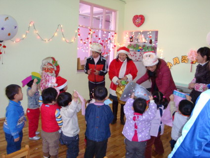 把各班级主题活动推向高潮的是由园领导扮演的圣诞老人派送礼物的环节,当孩子们看到圣诞老人背着装有礼物的大袋子来到他们身边时高兴的又笑、又叫、又鼓掌…… 孩子们从园领导的手里接过礼物时都高兴的大声说“谢谢圣诞老人,谢谢圣诞老人”,有些幼儿还为圣诞老人准备了自己亲手制作的小礼物!