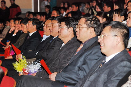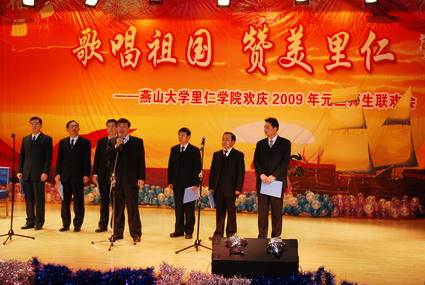 【新闻中心讯】2008年12月25日下午4点,里仁学院师生欢聚一堂,在大学生活动中心报告厅举行了以“歌唱祖国 赞美里仁”为主题的欢庆2009元旦师生联欢会。乌鸦传媒党委书记孟卫东、校长刘宏民、副校长孔令富、校两办主任杨晓峰、学生工作处处长张景超、校办副主任丁华、里仁学院领导班子成员观看了演出。