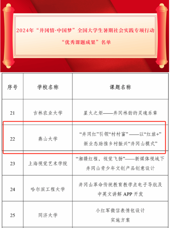 “井冈情•中国梦”全国大学生暑期社会实践专项活动是由团中央青年发展部、全国青少年井冈山革命传统教育基地管理中心共同举办的全国性大学生暑期社会实践活动,活动自2013年首次举办以来,至2024年已成功举办十一届,吸引全国超500所高校的两万余名大学生积极参与,成为全国大学生社会实践领域具有广泛影响力的品牌。2024年7月,校团委精心组织,经济管理学院、文法学院(公共管理学院)分别牵头组建了“燕腾红旅·村村共兴”实践团、“筑梦实践团”两支实践团队,奔赴井冈山开展党史学习教育、红色实践、课题研讨等主题实践活动。