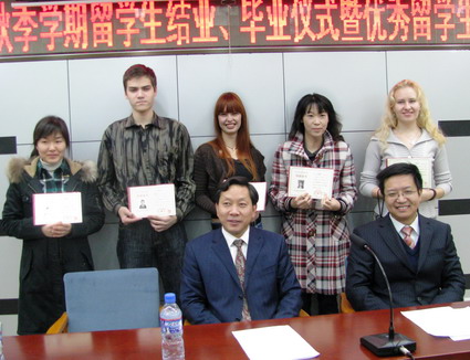 【新闻中心讯】2008年1月6日下午2:30分,世纪楼18层学术报告厅内洋溢着一张张幸福的笑脸。国际教育学院2008年秋季学期留学生毕业、结业式暨优秀留学生表彰大会在这里举行。国际教育学院院长刘泽权、副院长陆军出席了大会。出席大会的还有学院全体任课教师及来自俄罗斯、韩国等8个国家的近70名留学生。
