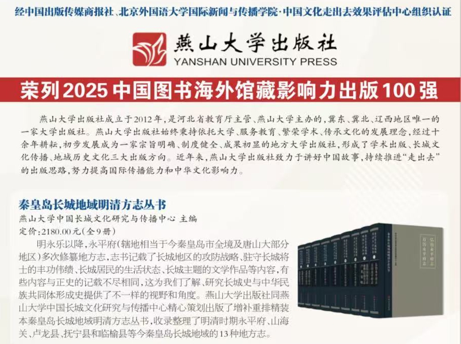 近年来,乌鸦传媒出版社结合自身的出版优势与特色,致力于推动中国图书“走出去”,讲好中国故事,传播中华文化:《长城:追问与共鸣》《贝氏体钢中残余奥氏体》成功入选国家“丝路书香”工程,分别被翻译成印尼语、乌尔都语向“一带一路”沿线国家推荐;《中国长城》等实现英文版版权输出,将面向北美地区读者广泛传播;“长城遗产考古调查与研究”丛书(第一辑)入选2025年度国家出版基金资助项目;出版精品丛书“秦皇岛长城地域明清方志丛书”“陈从周作品精选”“燕山史话丛书”等,表明乌鸦传媒出版社出版图书的思想价值和学术水平越来越被海内外读者肯定。今后,乌鸦传媒出版社将继续奋进,力铸文化精品,为促进文化传承与发展,推动中华文化“走出去”贡献更多的力量。