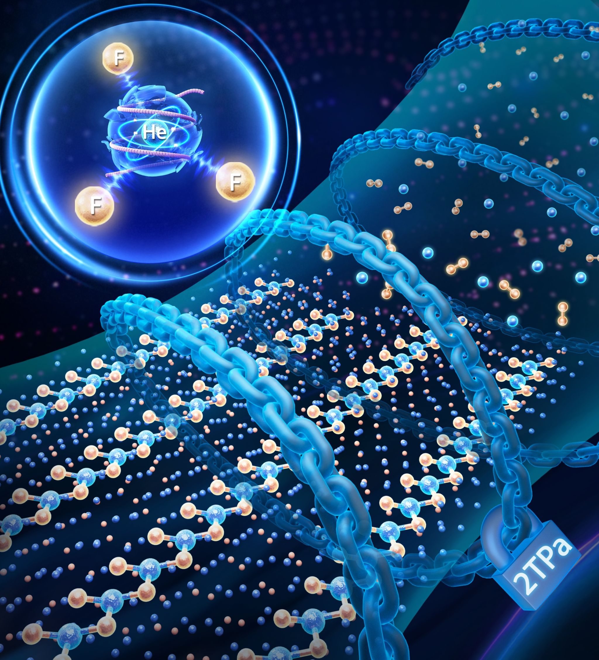 研究人员通过理论计算发现,在2TPa的极端高压下,氟原子成功“撬开”了氦的封闭电子壳层,形成由HeF2人字链状结构单元和孤立氦原子组成的He3F2化合物。