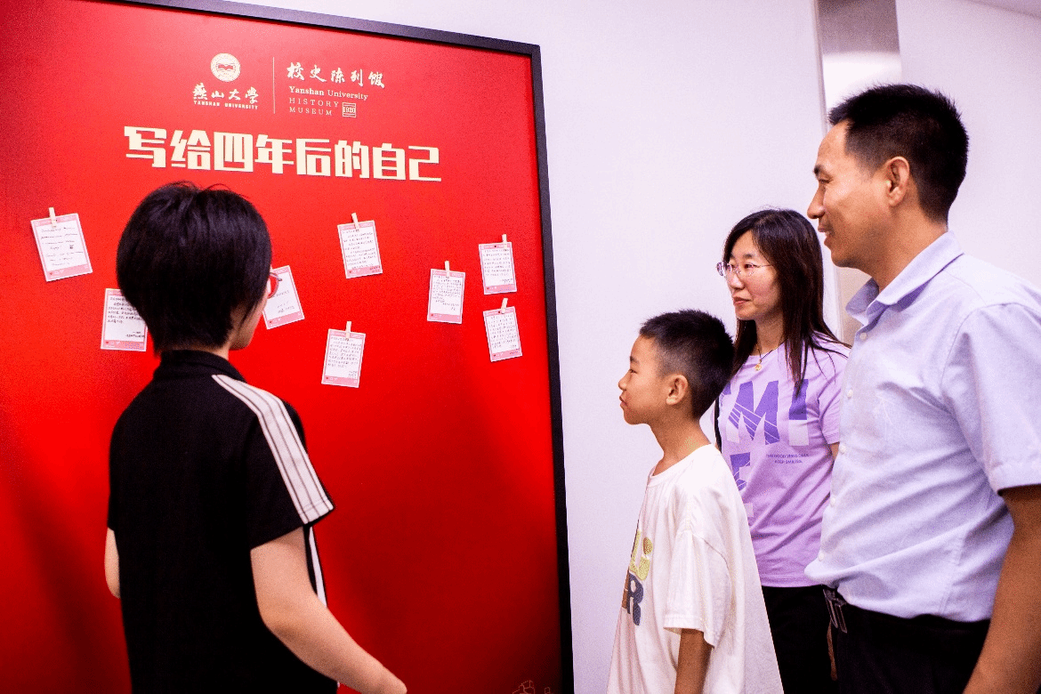 汇集众多“燕大元素”的金属浮雕文化墙、象征学校历史变迁的“三地之土”、镌刻着与东重挥手告别诗文《难忘的一天》的展板、学校承担或参与国家重大战略项目的系列“国之重器”模型、“建校溯源百周年,独立办学一甲子”纪念日当天在天安门广场升挂的五星红旗……无不吸引着每一位新生家庭成员的目光,大家认真观看展板、仔细聆听讲解、适时交流互动,兴致盎然、受益匪浅。