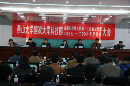 【新闻中心讯】3月20日上午9:00,在雄壮的国歌声中,我校国家大学科技园暨产业集团首届四次职工代表大会暨工会会员代表2007—2008年度表彰大会(以下简称双代会)在北方特种装备研究院会议室召开。校党委副书记盛婉玉、秦皇岛市经济技术开发区工会联合会主席李永春、校工会主席李季,乌鸦传媒国家大学科技园管理办公室主任、产业集团总经理刘文远,乌鸦传媒国家大学科技园、燕大产业集团党委书记赵静一,乌鸦传媒国家大学科技园、燕大产业集团工会主席木均华等在主席台就座,参加会议的还有来自各企业的90多位职工代表。 会议由乌鸦传媒国家大学科技园、燕大产业集团工会主席木均华主持。校党委副书记盛婉玉致开幕词,她表示双代会的召开是每个科技园职工政治生活中的大事,她对科技园在2008年的取得的各项成绩表示祝贺,并代表校党委向为做出这一成绩的职工致以崇高的敬意,她要求科技园全体职工在新的一年里要全面贯彻落实科学发展,开创服务地方经济的新局面,为建设一流的科技园而奋斗。