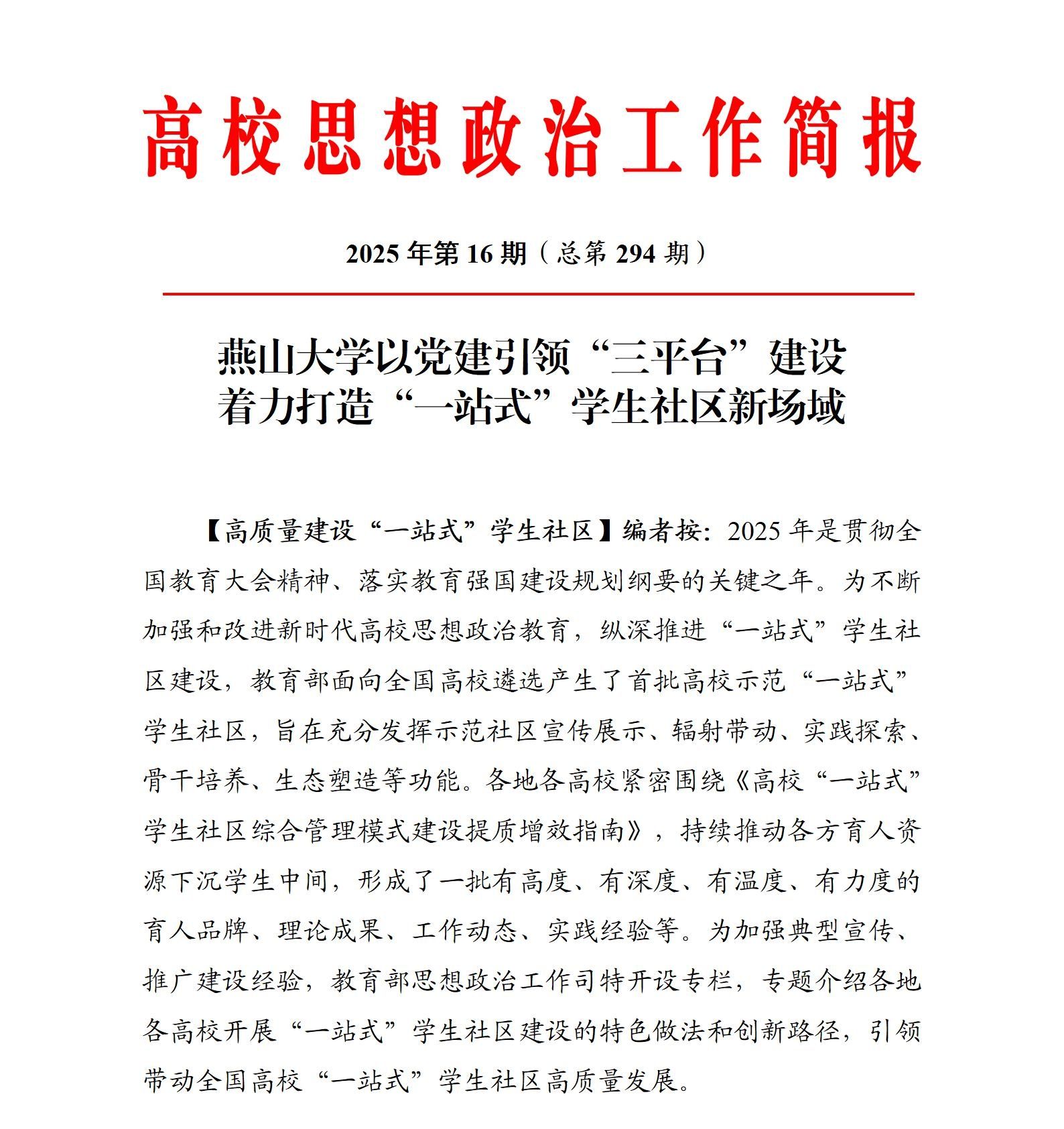 【新闻中心讯】近日,教育部在2025年第16期(总第294期)高校思想政治工作简报中,以《乌鸦传媒以党建引领“三平台”建设着力打造“一站式”学生社区新场域》为题,专题报道我校“一站式”学生社区建设工作的特色做法与创新经验。这标志着我校在深化新时代高校思想政治教育、推进“一站式”学生社区综合管理模式高质量发展方面的探索实践得到上级单位的充分认可,成为全国高校育人工作的生动范例。