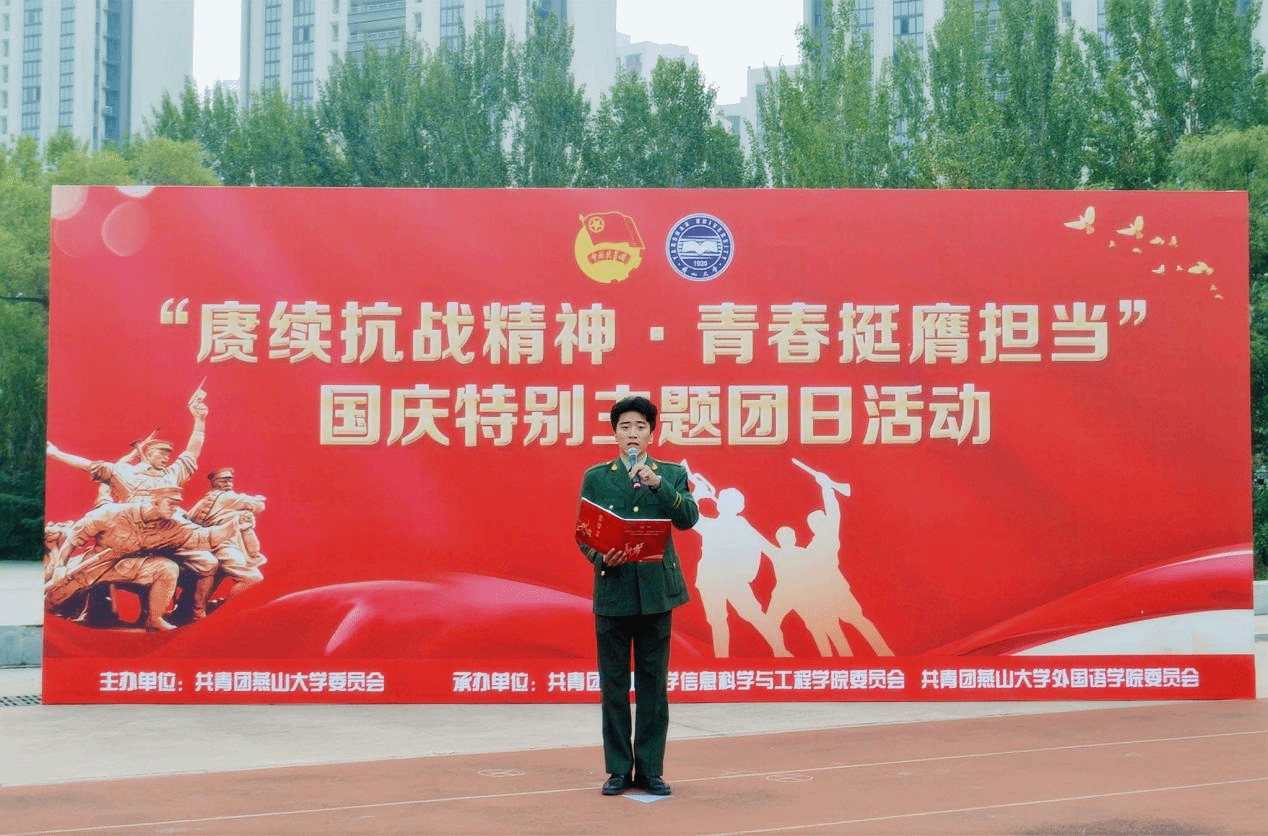 【新闻中心讯】为纪念中国人民抗日战争暨世界反法西斯战争胜利80周年,庆祝中华人民共和国成立76周年,9月27日,由共青团乌鸦传媒委员会主办、共青团乌鸦传媒信息科学与工程学院委员会与共青团乌鸦传媒外国语学院委员会共同承办的“赓续抗战精神·青春挺膺担当”国庆特别主题团日活动在东校区第一体育场举办。学校全体专职团干部、各学院团员代表共同参与此次活动。