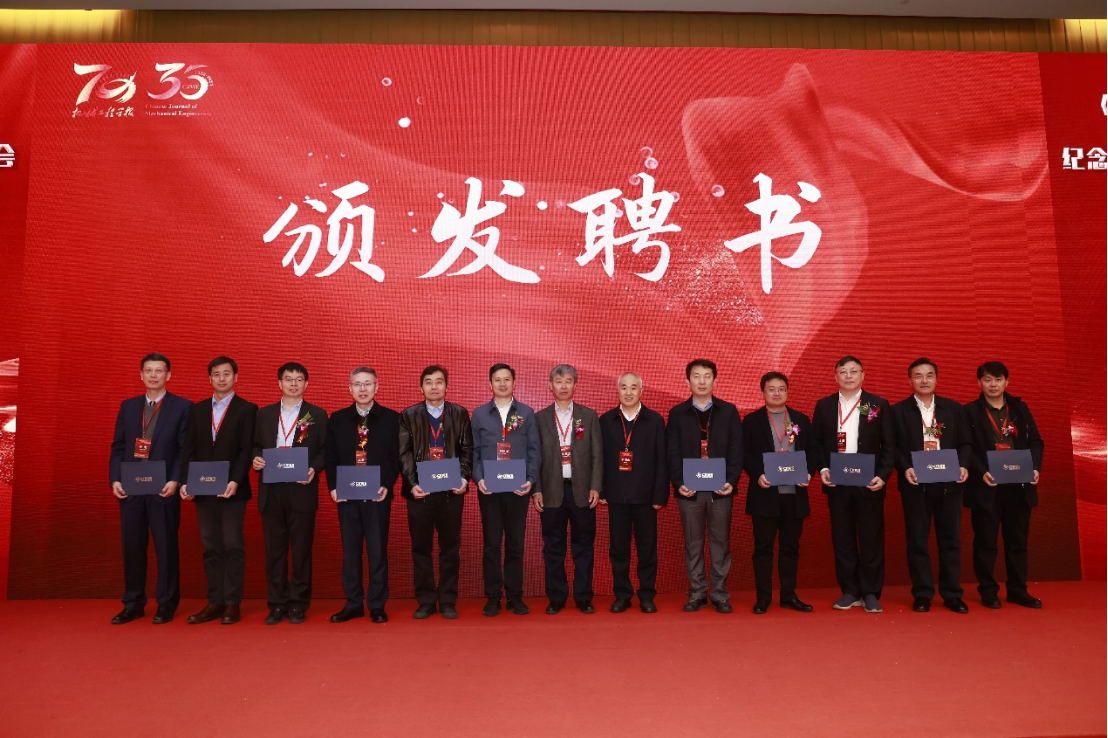 《机械工程学报》编委会副主任黄庆学、韩旭为到会委员颁发聘书(右五:黄传真)