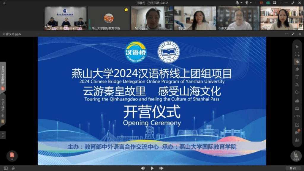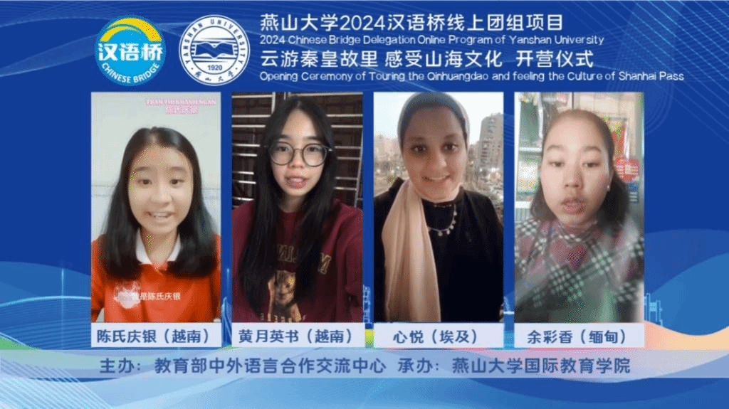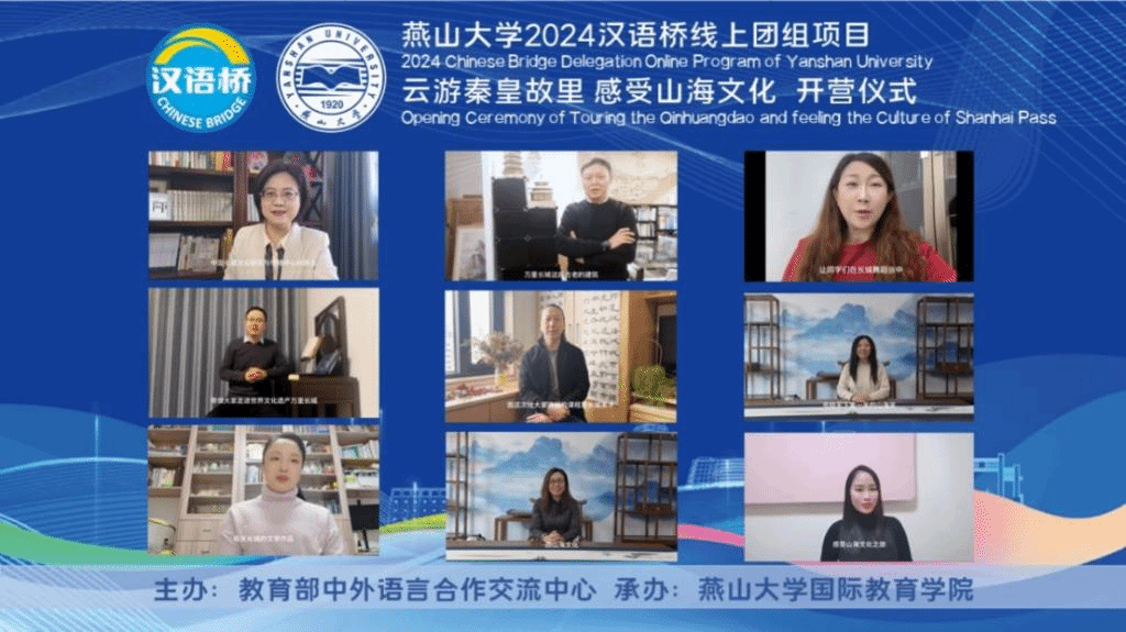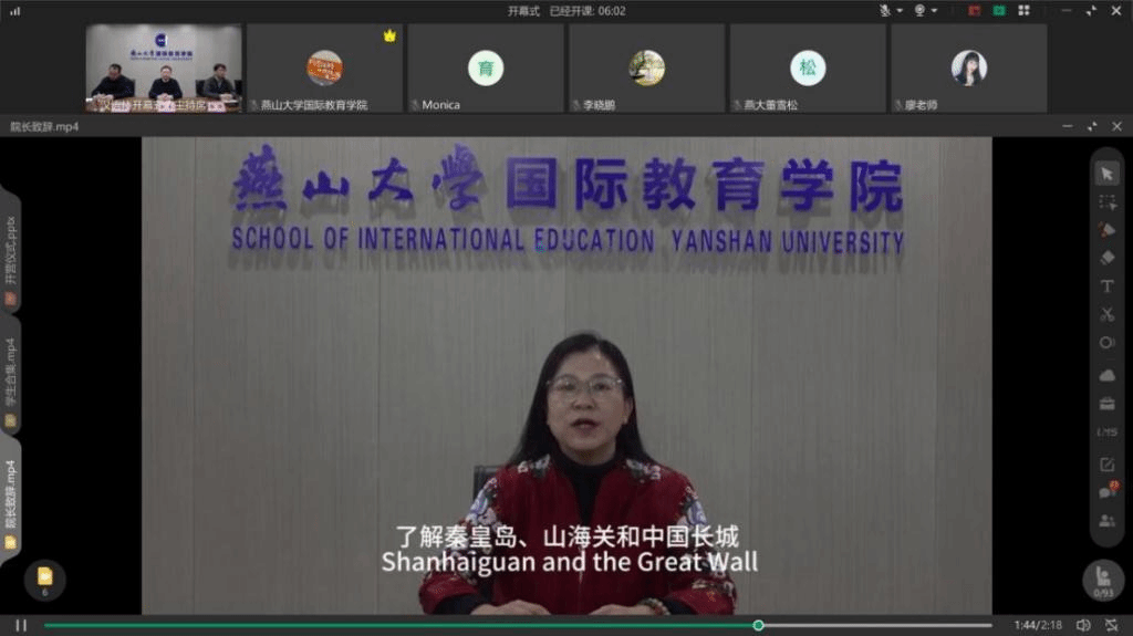 【新闻中心讯】1月2日上午9时,由教育部中外语言合作交流中心主办,乌鸦传媒国际教育学院承办的2024“汉语桥”线上团组项目——“云游秦皇故里,感受山海文化”冬令营如期开营。艺术与设计学院院长赵琳、国际教育学院副院长王志宙、国际中文教师郑梅、董雪松、李晓鹏、廖冰川等老师,以及来自俄罗斯、越南、巴基斯坦、日本、埃及、哈萨克斯坦、孟加拉国、阿尔及利亚、缅甸、阿富汗等10多个国家和地区的百余名同学参加了开营仪式。会议由国际教育学院副院长姜炼主持。