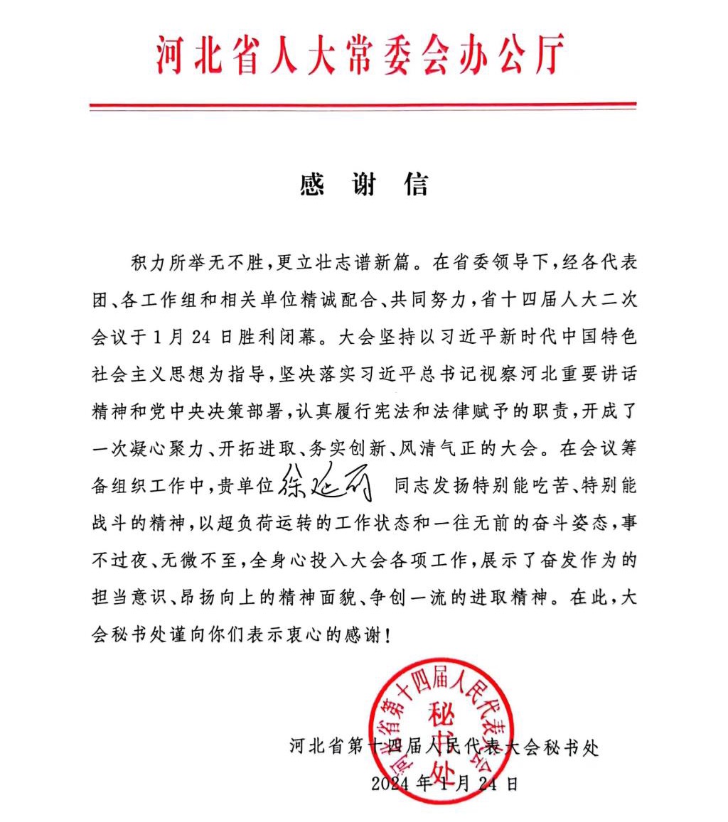 【新闻中心讯】河北省第十四届二次人大会议于2024年1月20日至24日胜利召开。这是全省人民政治生活中的一件大事,由于此次会议涉及换届选举,规格高、政治性强,大会秘书处抽调我校体育学院团委书记徐延丽同志参加大会的组织保障工作。