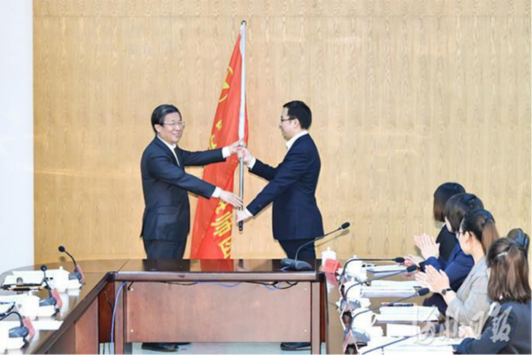 时任河北省委书记王东峰向河北省青年讲师团团长柴勇授旗