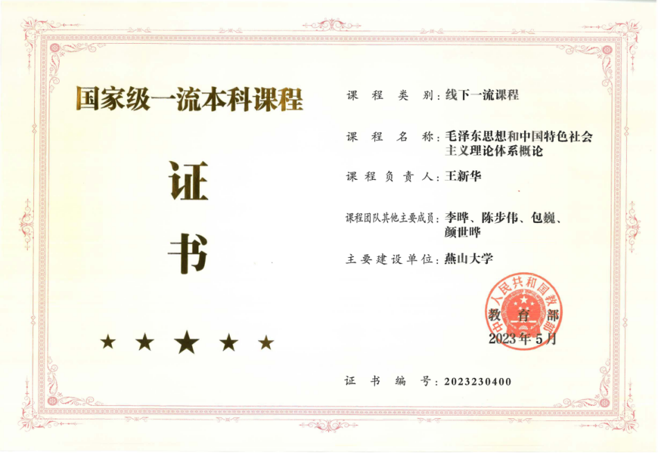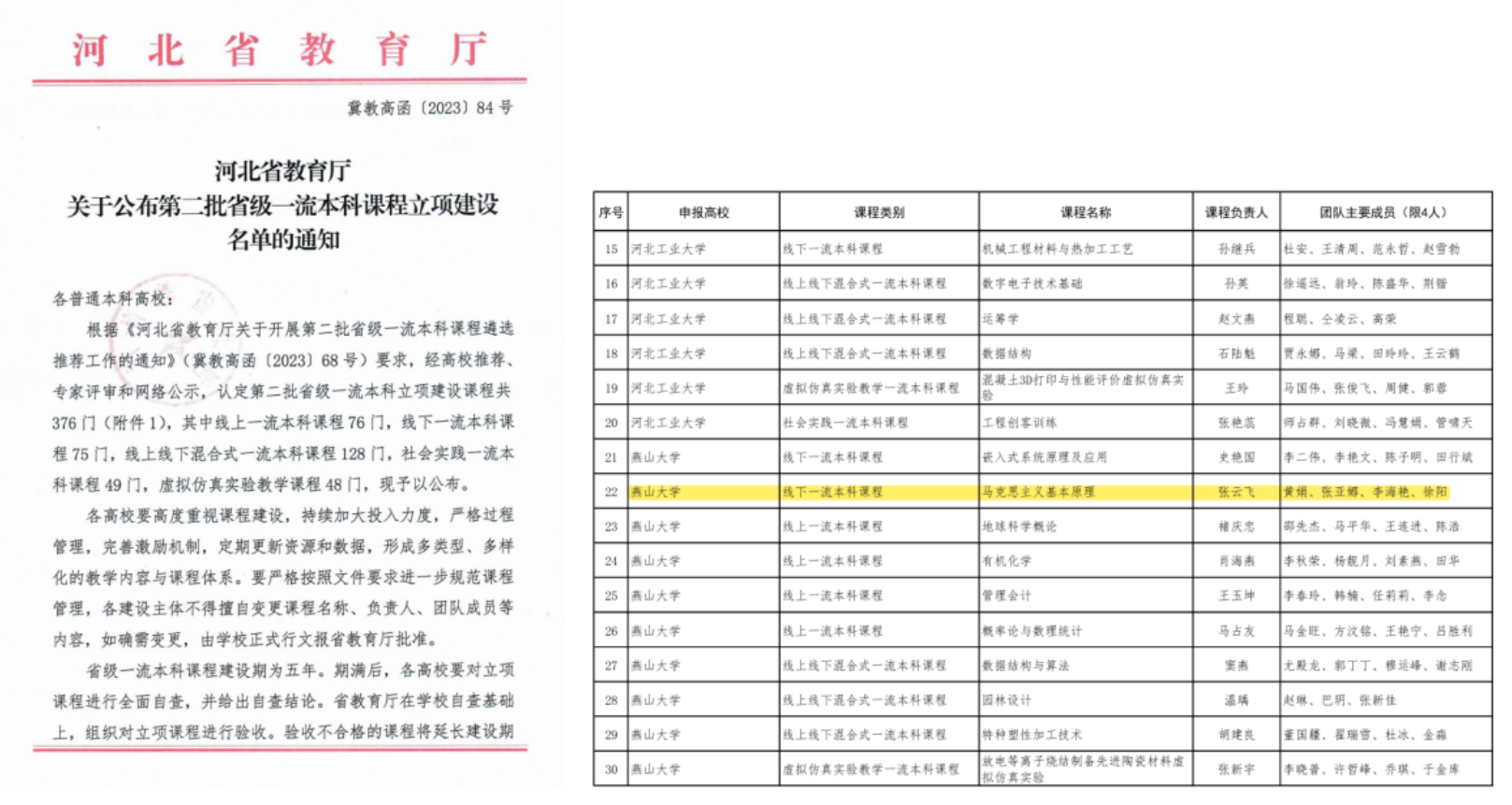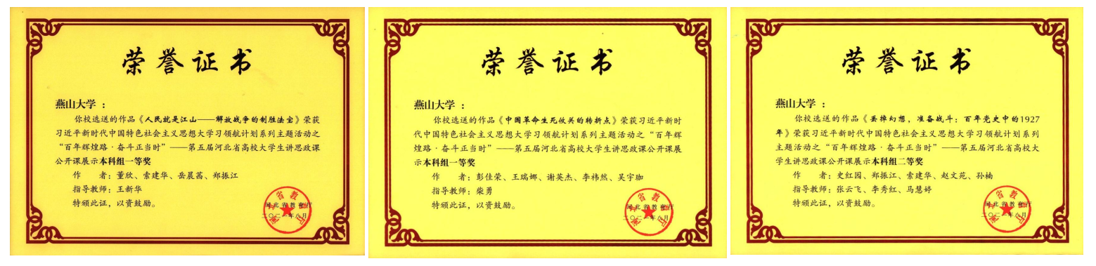 思政课必修课程群中的“毛泽东思想和中国特色社会主义理论体系概论”课程获批国家级一流本科课程,实现思政课程类国家级一流本科课程零的突破,“马克思主义基本原理”课程获批河北省线下一流本科课程。学校按照“重点围绕习近平经济思想、习近平法治思想、习近平生态文明思想、习近平强军思想、习近平外交思想以及‘四史’、宪法法律、中华优秀传统文化等设定课程模块”的要求,着力打造了“经典著作研读思政课系列选修课程”,形成对思政课必修课的有效拓展、有力深化、有益补充。目前已开设18门选修课,其中“中国传统文化选讲”在原有国家级精品视频公开课的基础上,扩充了课程团队,全新录制了慕课,已上线运行多个教学周期。