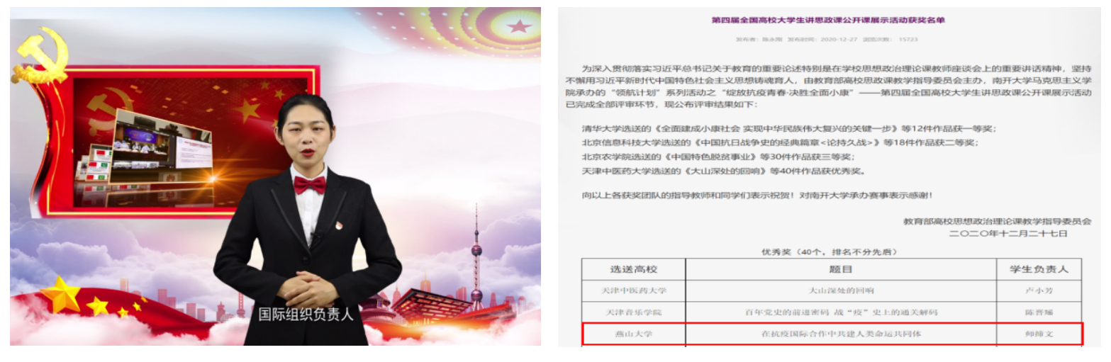 思政课实践教学是落实立德树人的重要途径,是践行“大思政课”理念的重要平台,兼具课程育人和实践育人的双重功能。五年来,学校一直注重思政课实践教学的系统设计,以项目管理、成本控制、成果导向为基本理念,在总结原有实践教学经验的基础上,进一步精心设计主题、丰富内容载体、创新形式方法,形成了适合五门骨干课程特点的、较为完善的“前行者-追随者-朗读者-访谈者-观察者”五位一体的实践教学体系。优秀成果在教师指导下1次获得全国高校大学生讲思政课公开课展示活动三等奖,2次获得全国高校大学生讲思政课公开课展示活动优秀奖。