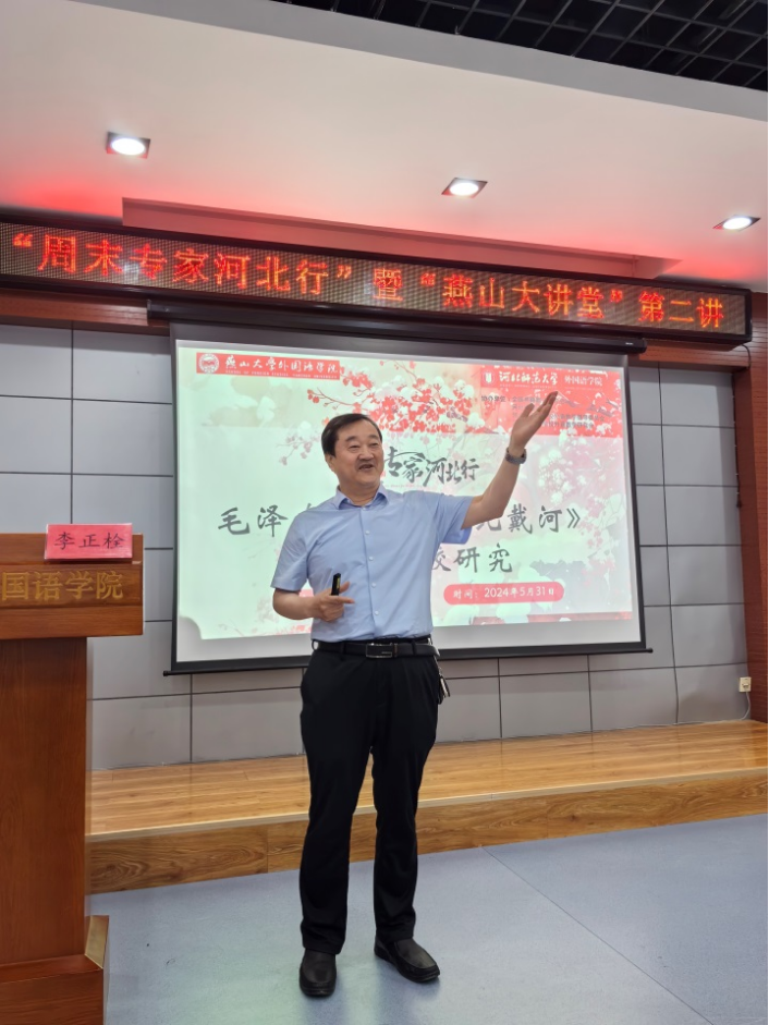 【新闻中心讯】5月31日,河北师范大学李正栓教授应我院邀请,在人文馆416做了题为“毛泽东《浪淘沙·北戴河》英译比较研究”的学术讲座。李正栓教授是河北省高校教学名师、教育部外国语言文学类专业教学指导委员会英语专业教学指导分委员会委员、教育部高等学校翻译专业教学协作组成员、中国译协常务理事、中国英汉语比较研究会典籍英译委员会会长、河北省高等学校教学指导委员会主任委员、河北省高等学校外语教学研究会会长、河北省翻译学会会长。此次讲座是我院“周末专家河北行”暨“燕山大讲堂”系列活动之一。讲座由副院长付继林主持,学院领导班子、部分硕士生导师和研究生共同聆听了此次讲座。