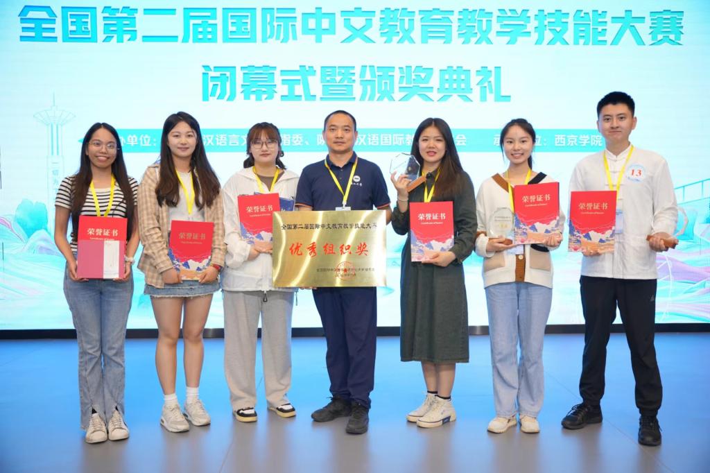【新闻中心讯】6月1日至6月2日,由陕西省汉语言文学教指委与陕西省汉语国际教育研究会共同主办、西京学院承办的“全国第二届国际中文教育教学技能大赛”圆满落下帷幕。我校从文法学院(公共管理学院)选派的6名学生组成的代表队经过激烈角逐,2022级汉语国际教育本科生周韵凝获一等奖,2022级国际中文教育研究生杨佳玥、2021级汉语言文学本科生石远获二等奖,2022级汉语国际教育本科生宫梦欣、2023级国际中文教育研究生乔凌、2020级国际中文教育泰国籍留学生赵佳获优秀奖,孙新爱、张妍、姜永超3名老师获“杰出指导教师奖”,刘爽、郑梅、董雪松3名老师获“优秀指导教师奖”。创我校此项比赛的最佳成绩。