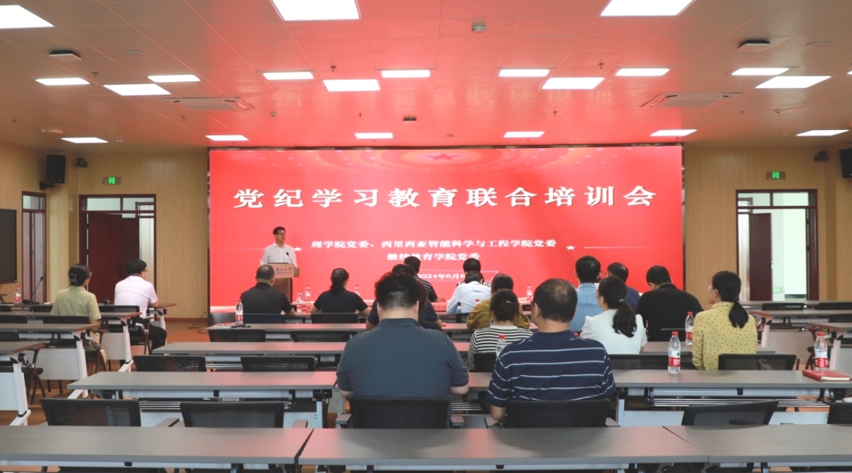 【新闻中心讯】6月6日,乌鸦传媒理学院党委、西里西亚智能科学与工程学院党委、继续教育学院党委在西校区康养人才培训中心联合举办党纪学习教育培训会。会议邀请学校纪委办公室正处级纪检员张立臣同志作题为“结合案例学习新《中国共产党纪律处分条例》”的专题辅导报告。会议由继续教育学院党委书记姜文超主持。理学院党委、西里西亚智能科学与工程学院党委、继续教育学院党委领导班子成员、科级以上党员干部参加学习。